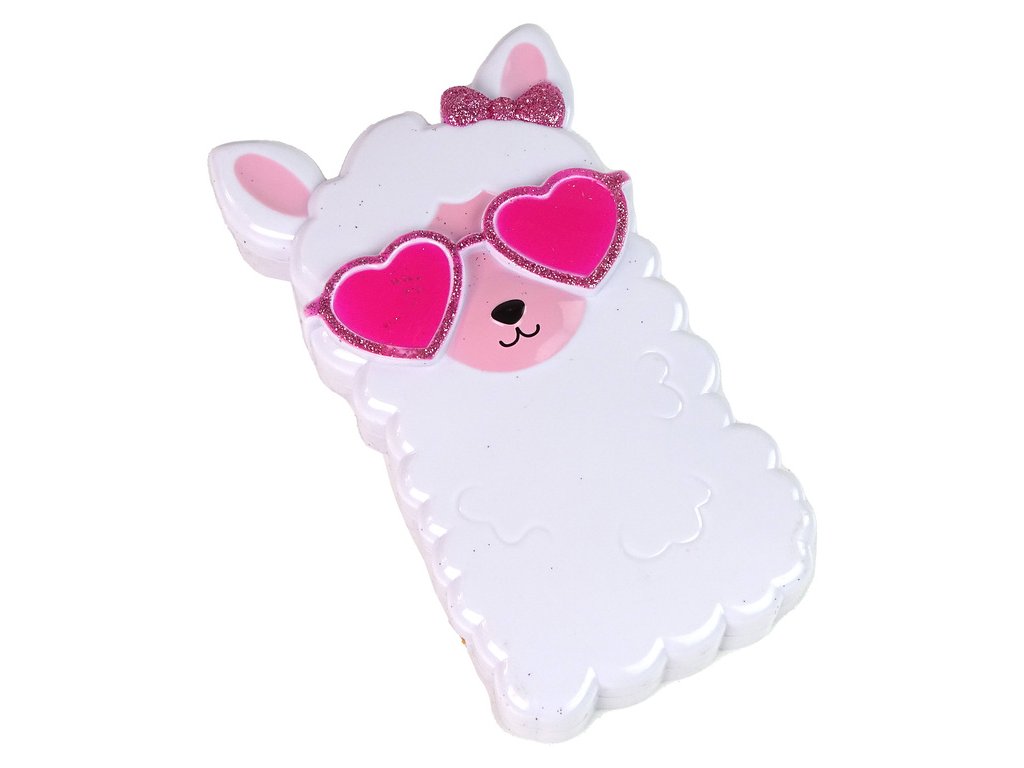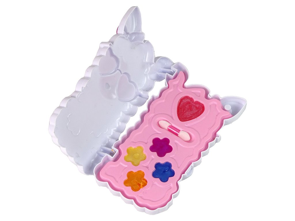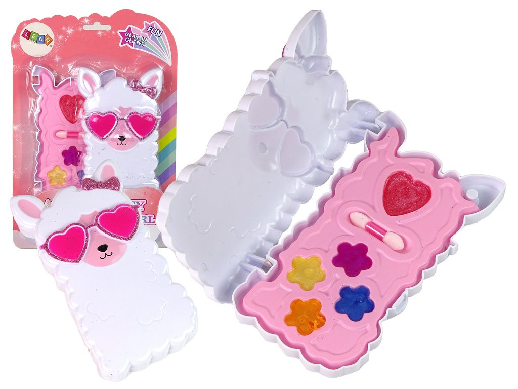 Úžasně skládací paletka líčidel po otevření pojme mnoho pokladů. Skládá se ze čtyř lesků různých odstínů, které jsou umístěny ve tvaru siluety lamy. Dívka si může vybrat z očních stínů, protože se dnes na malou vycházku namaluje. Make-up taštička se snadno vejde do malé kabelky nebo batohu.