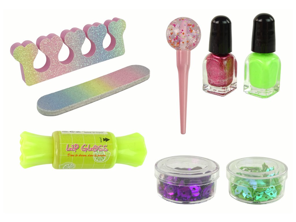 Sada obsahuje mnoho atraktivních prvků, které potěší každého mladého milovníka stylu. Kosmetický separátor vám pomůže nalakovat nehty lakem a 2 lesky na rty dodají šarm a lesk. Pilník na nehty a tři laky na nehty, včetně dvou třpytivých a jednoho světlého, vám umožní kreativně ozdobit nehty v různých provedeních.
