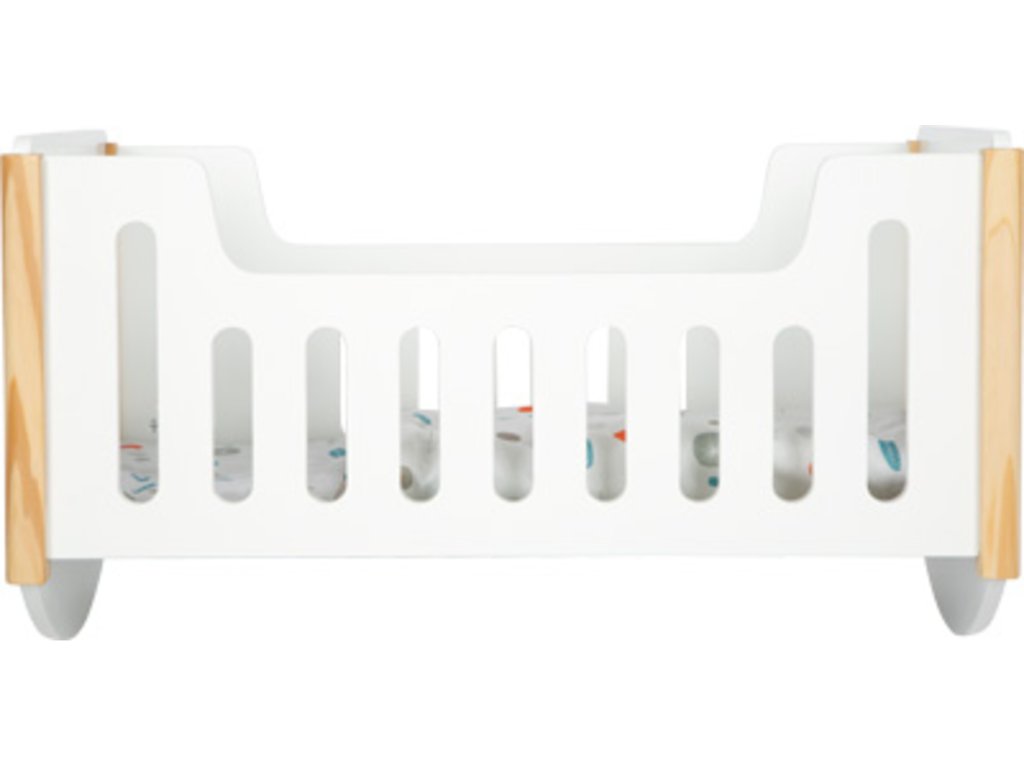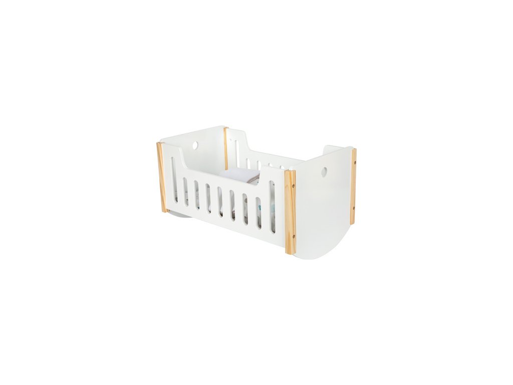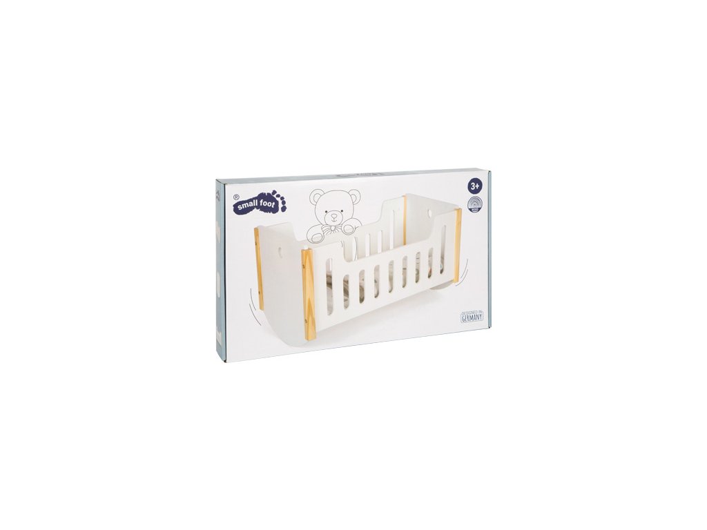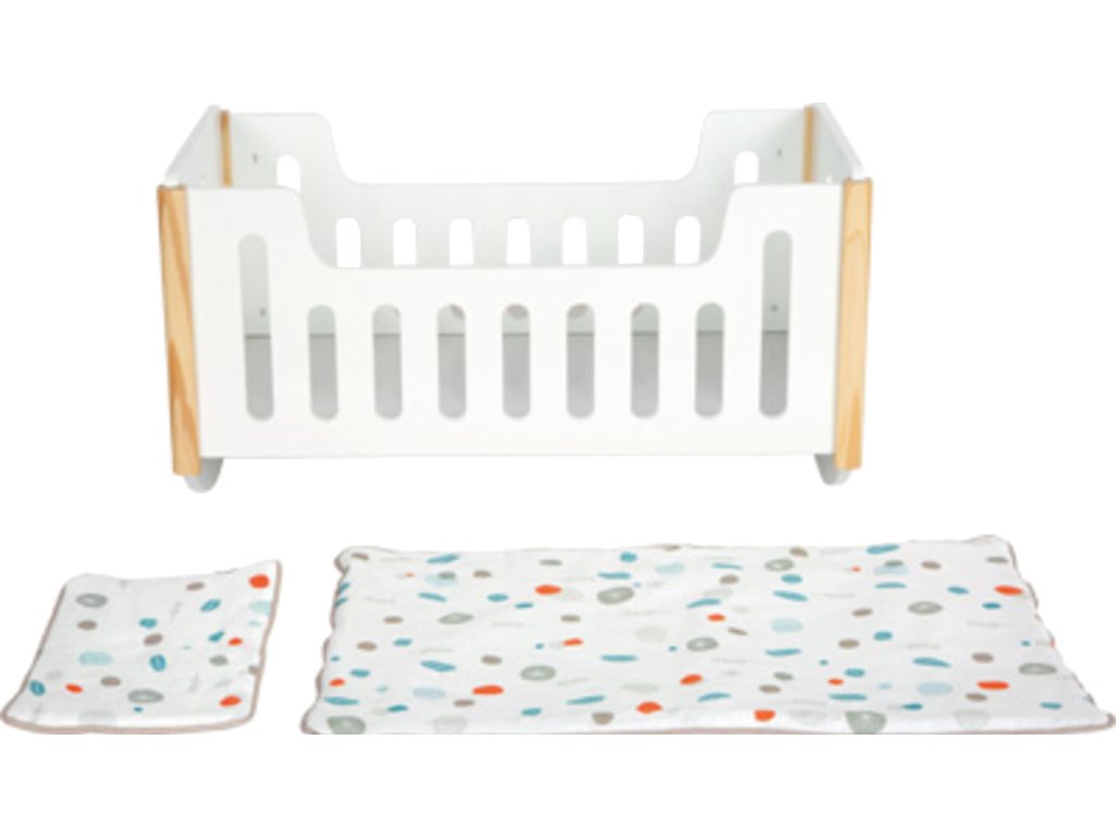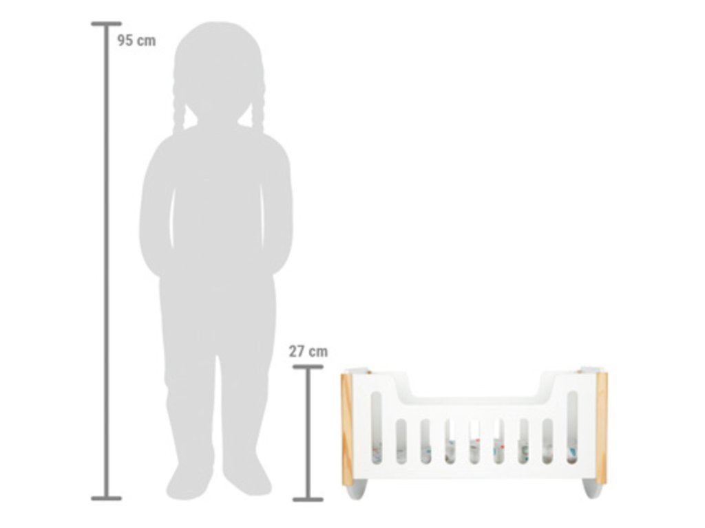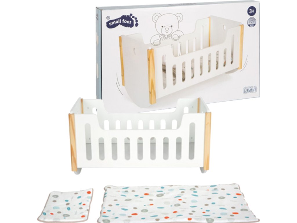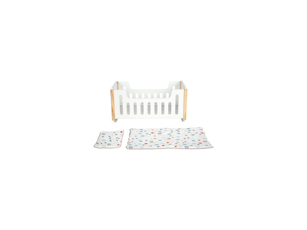 Tato rozkošná postýlka vyrobená ze stabilního dřeva v bílých barvách zdobená pěknou grafikou umožní holčičkám jemně houpat své panenky a plyšové hračky vysoké až 46 cm. Je podšitá bílou dekou s barevným vzorem a má malý měkký polštářek.