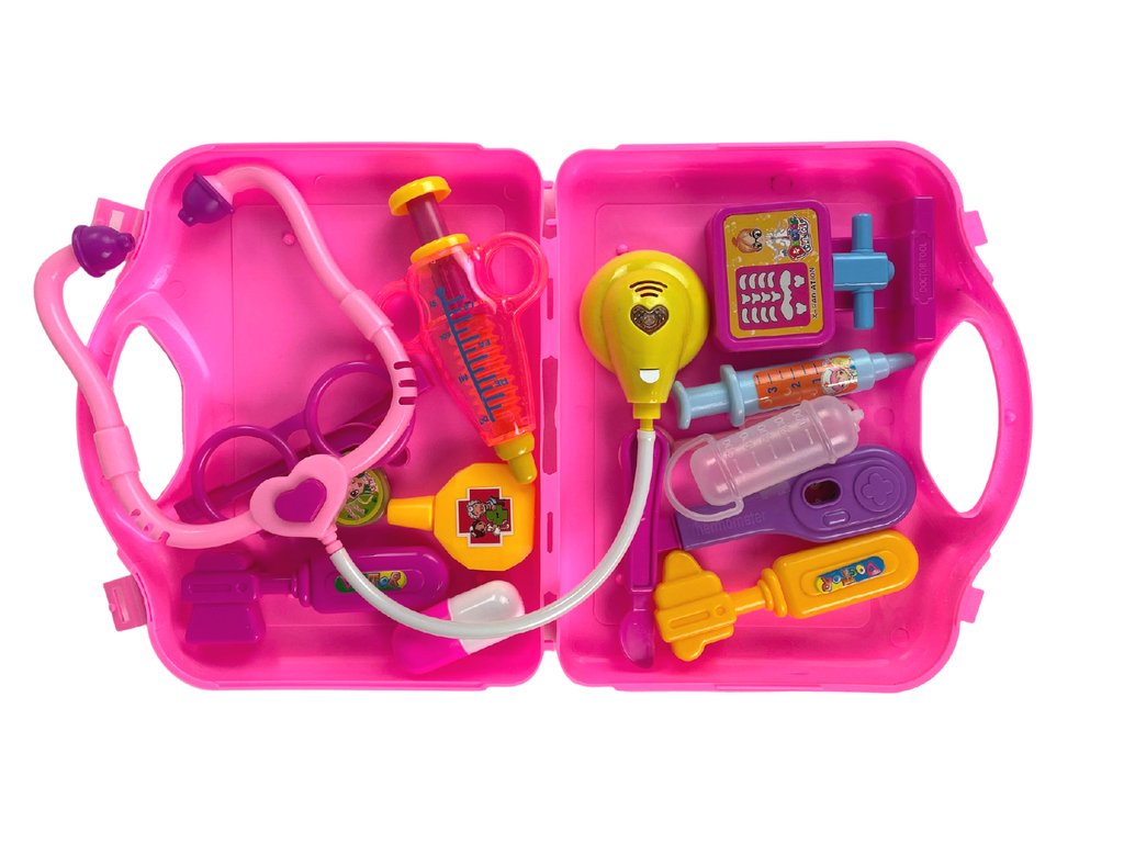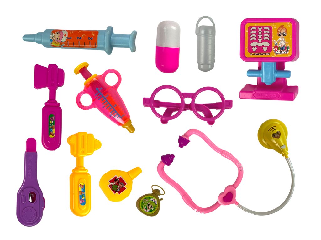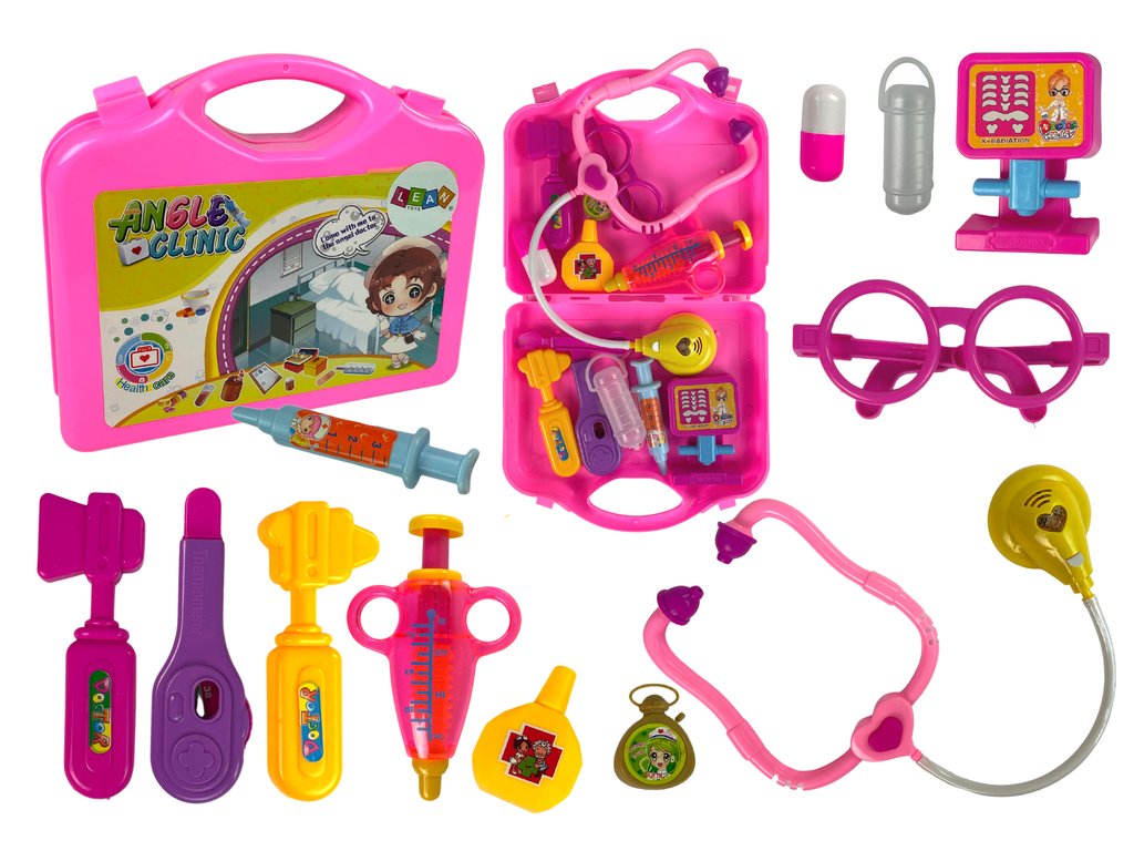 Zobrazené lékařské nástroje jsou dokonalou reprodukcí a imitací skutečných nástrojů, které dostaly lehké, aerodynamické tvary vhodné pro děti. Ideální pro malé ručičky. Všechny díly vyrobené z plastu, bezpečné pro děti. Nástroje se dodávají v krásném růžovém kufříku, který si může vzít kamkoli s sebou.