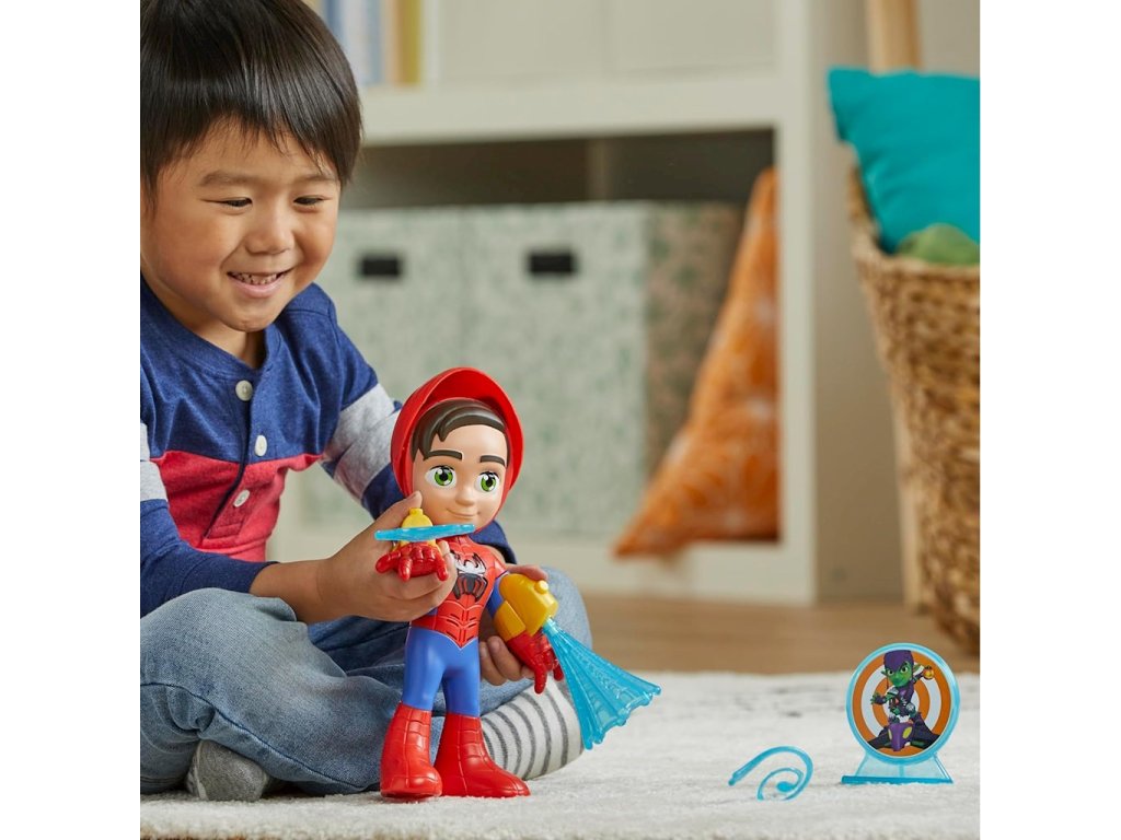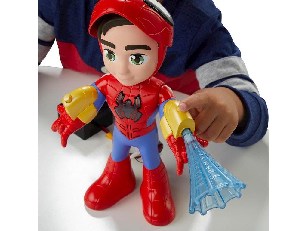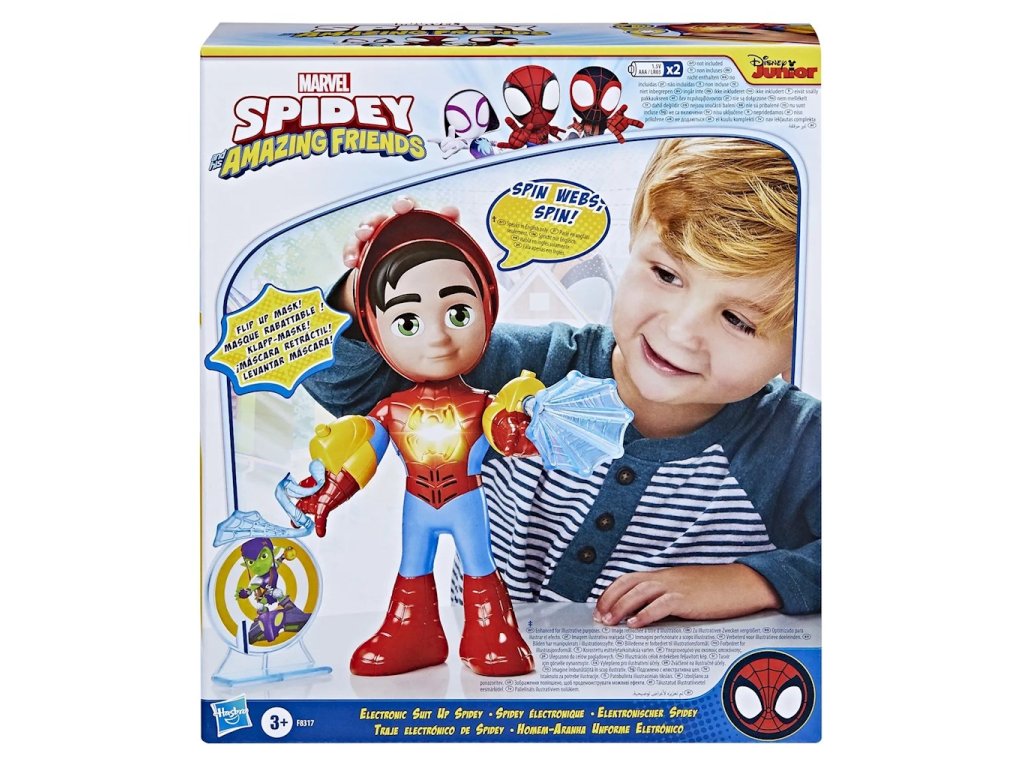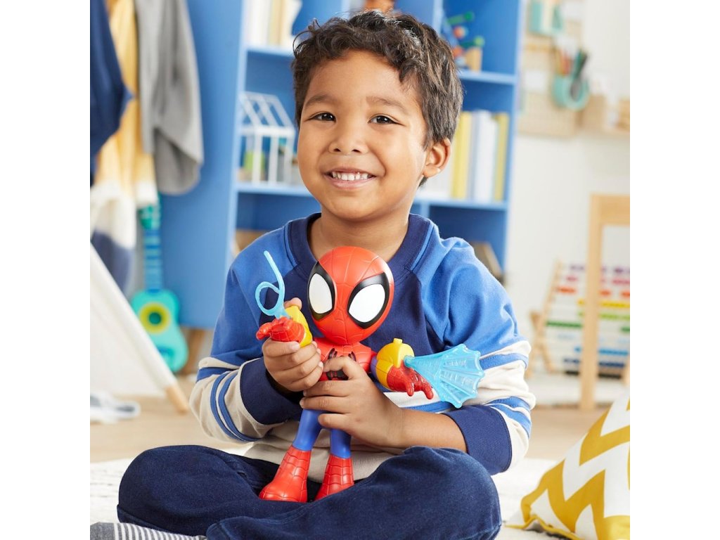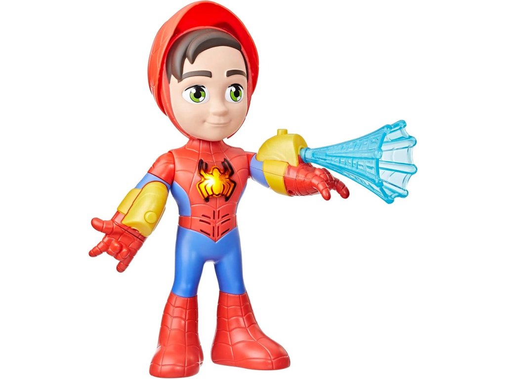 Marvel Spidey & Super-Palms Interaktivní figurka Spidey 25cm světlo a zvuk F8317Tato interaktivní figurka Spideyho je hračka, kterou děti nebudou chtít odložit! Tato figurka Spideyho obsahuje masku, kterou mohou děti zvednout a spustit, aby odhalily tvář Petera Parkera, zvuky a fráze z představení a ikonu na Spideyho hrudi, která se rozsvítí.