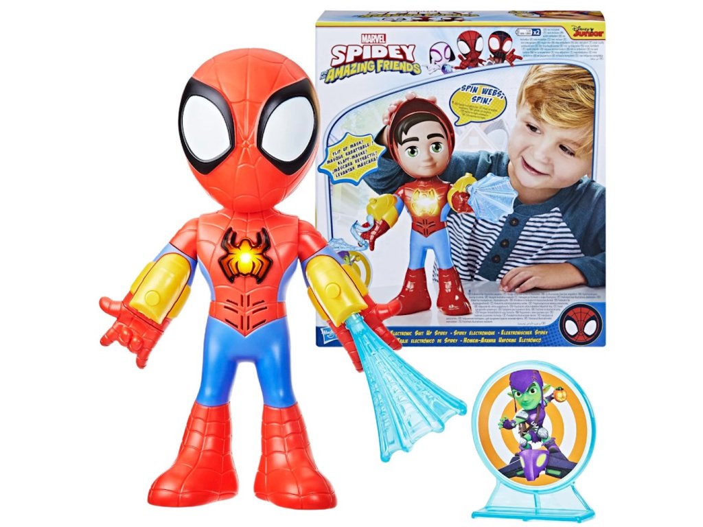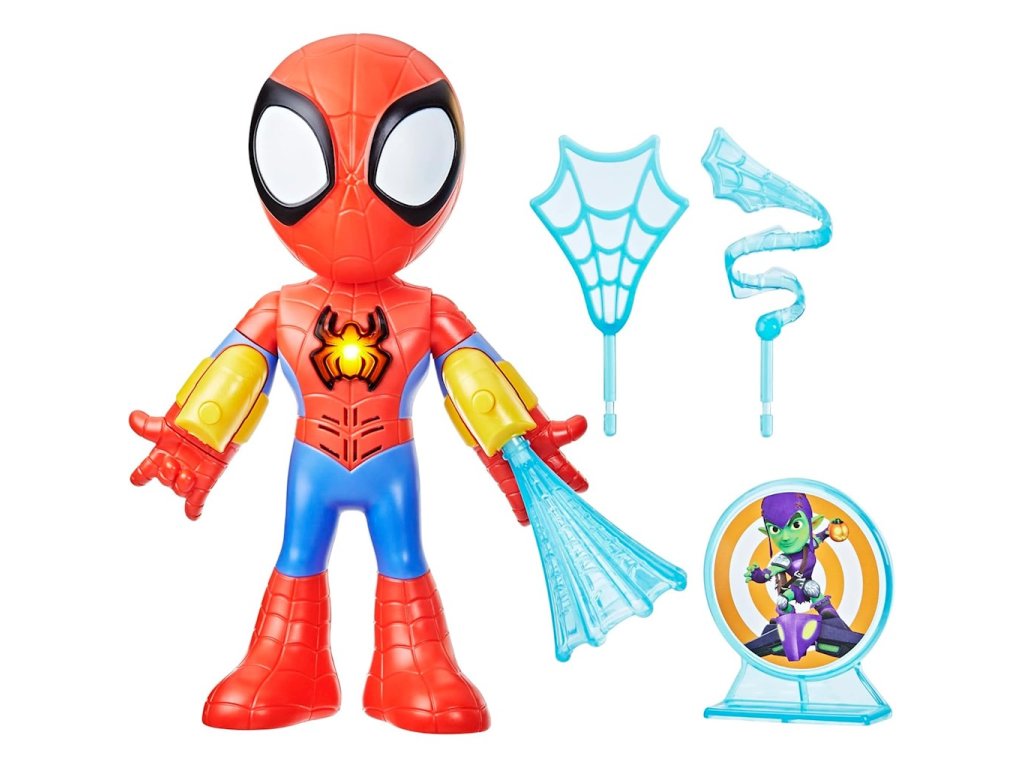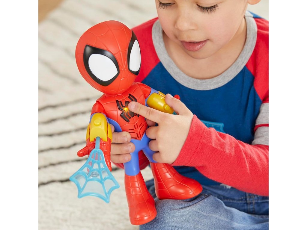 • Stiskněte Spideyho ikonu na jeho hrudi, abyste slyšeli vzrušující fráze a zvuky z pořadu, pak sledujte, jak se Spidey rozsvítí!