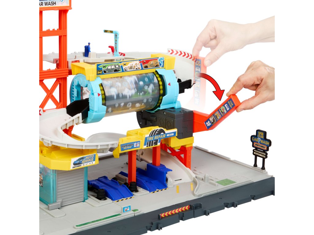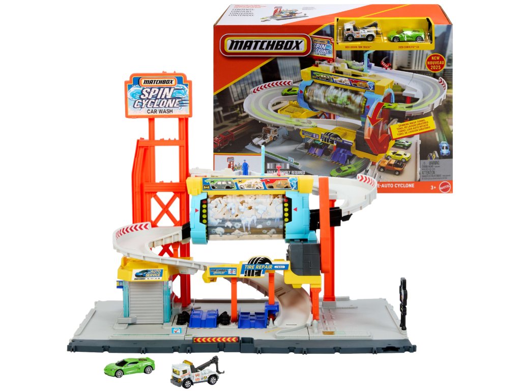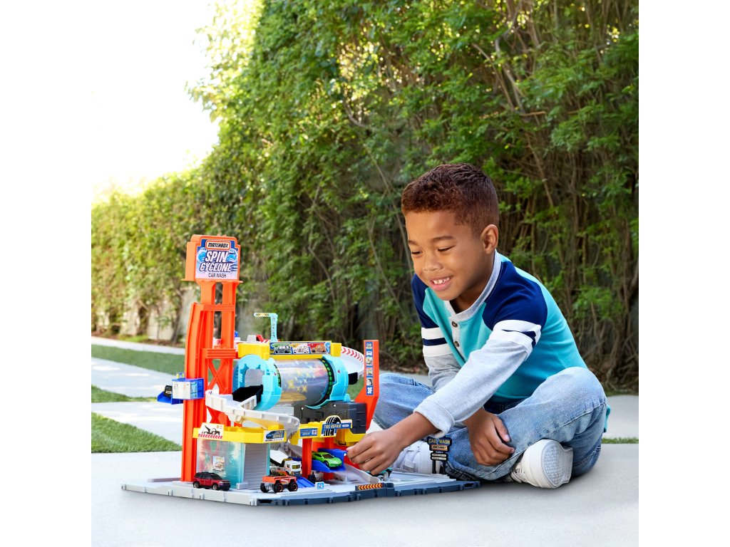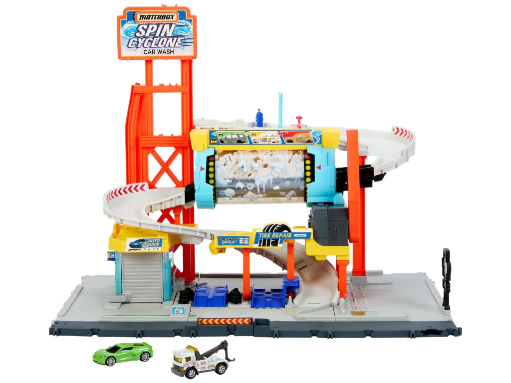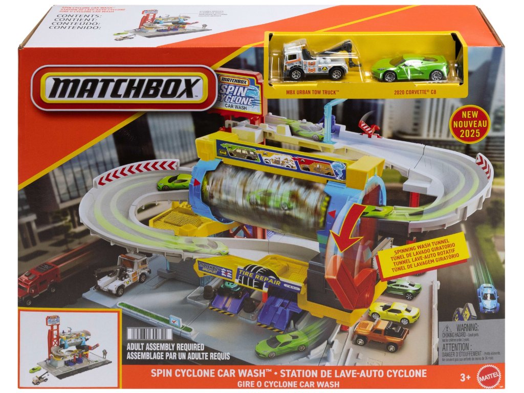 Matchbox Turbo Cyclone Car Wash je interaktivní myčka aut, dílna a parkoviště v jednom. Sada umožňuje příběhy o opravách, testech pneumatik a velkolepém „kaskadérském“ čištění v průhledném tunelu. Sada obsahuje odlitek v měřítku 1:64 Corvette auto a odtahový vůz, které dále vylepšují hratelnost.