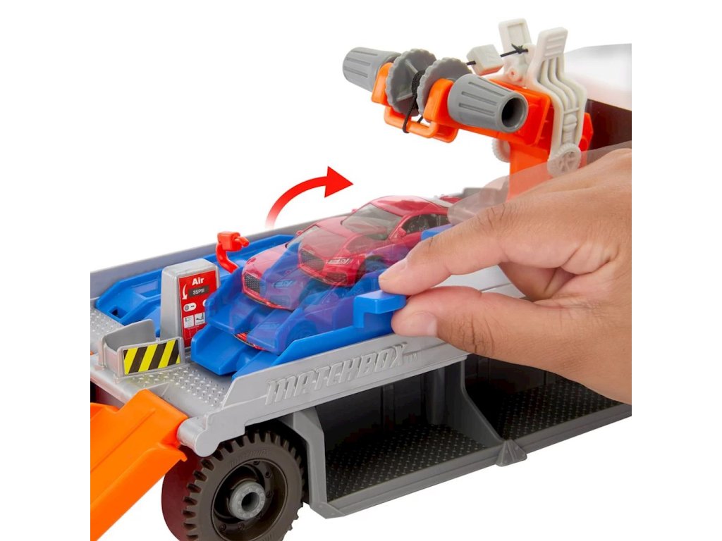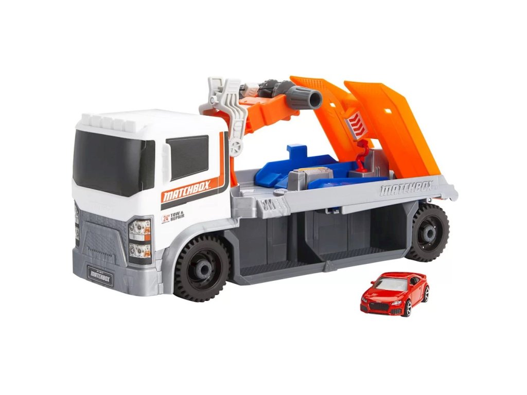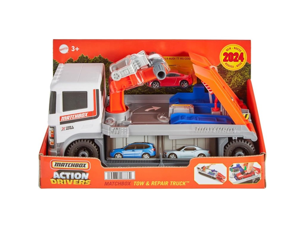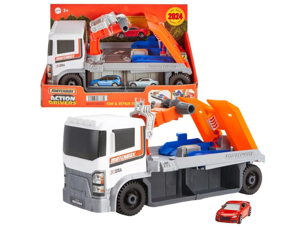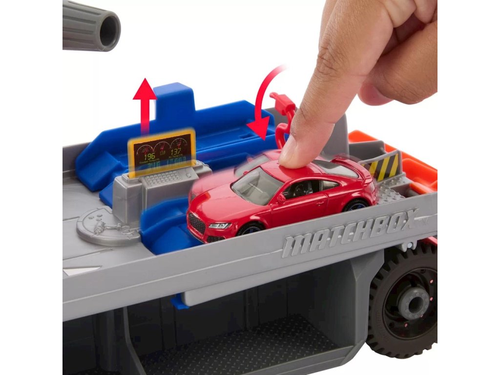• Vozidlo má pojízdný jeřáb, který dokáže zvednout auta v měřítku 1:64 odtahový vůz ke kontrole. Sada obsahuje jedno kovové autíčko Matchbox Audi TT RS Coupe