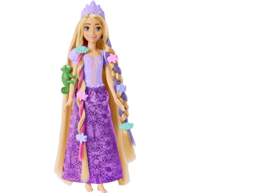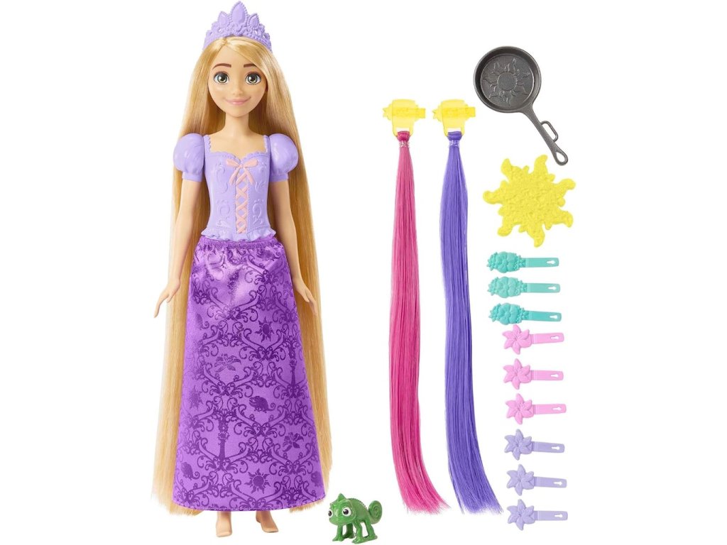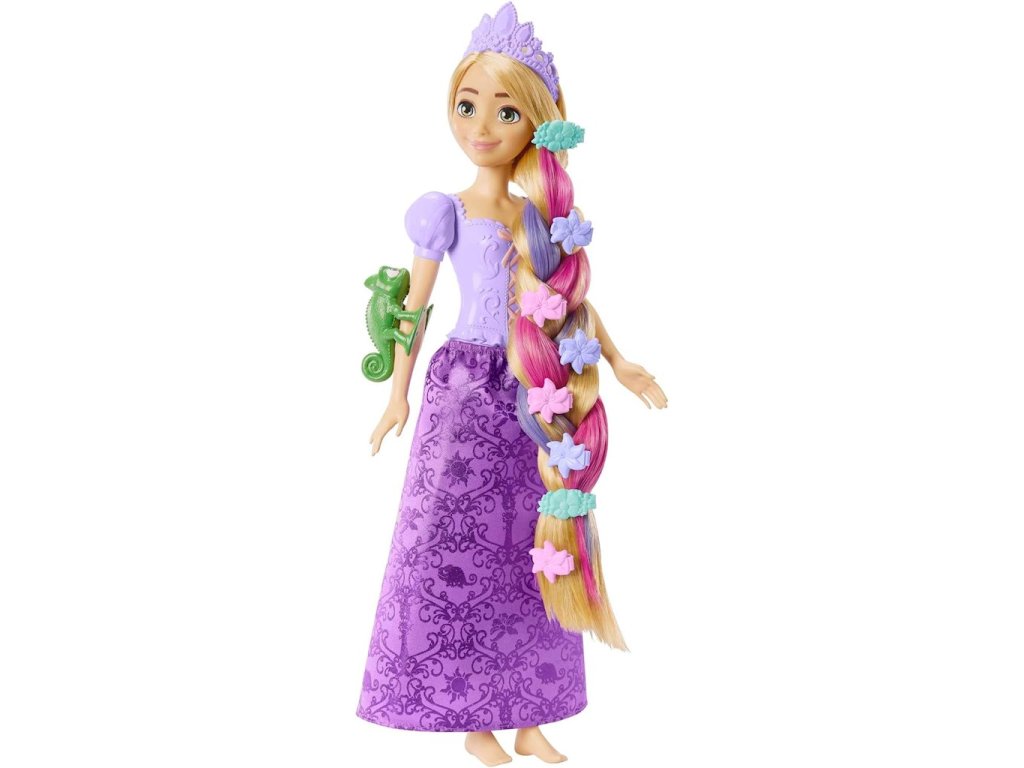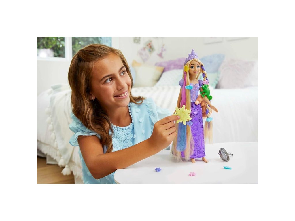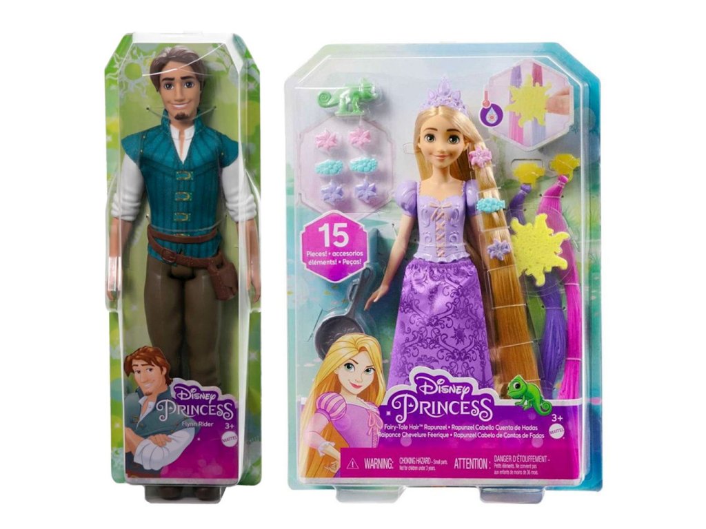 Sada panenek Mattel Disney Princesses Rapunzel s vlasovým stylingem Pascal HLW18 + panenka Flynn Rider HLV98Rapunzel vypadá jako z pohádky. Panenka má dlouhé, krásné blond vlasy, samozřejmě. Vlasy jsou tak dlouhé, že byste mohli obtočte celou panenku. Jsou perfektní na česání, sada obsahuje kartáč na vlasy, nástavce, které lze obarvit houbičkou, 9 doplňků pro úpravu vlasů.