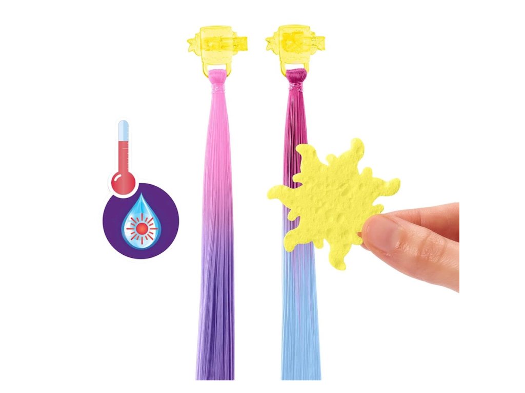 • Rapunzel má 2 nástavce, které mění barvu v teplé vodě: z fialové na růžovou a z růžové na modrou,