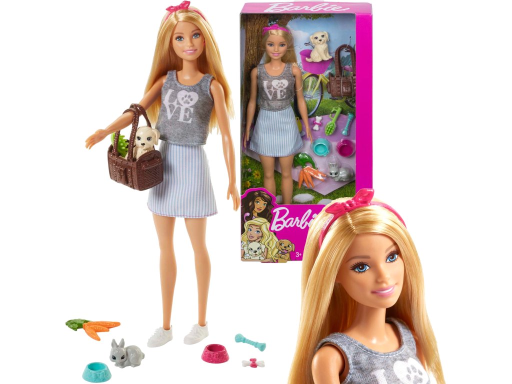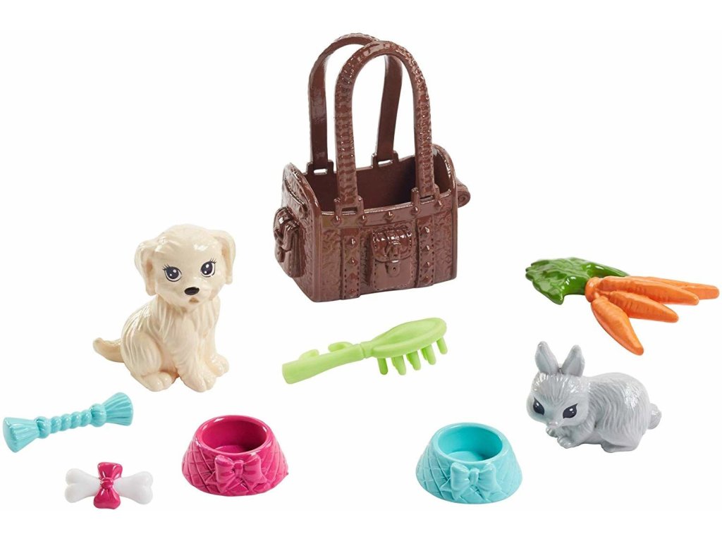 Kromě panenky Barbie obsahuje balíček figurky pejska a králíka a nezbytné doplňky. Barbie miluje péči o své mazlíčky. Nosí kost pro psa, mrkev pro králíčka a dvě misky, aby žíznivá zvířátka měla napájeno. Sada obsahuje 6 doplňků, které zpestří hraní.
