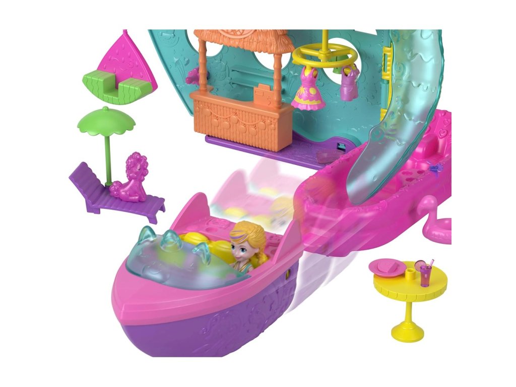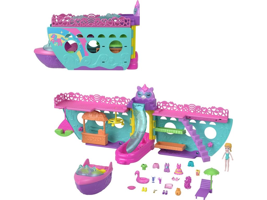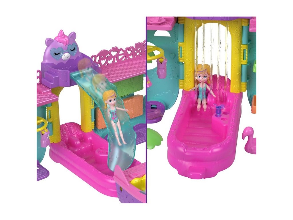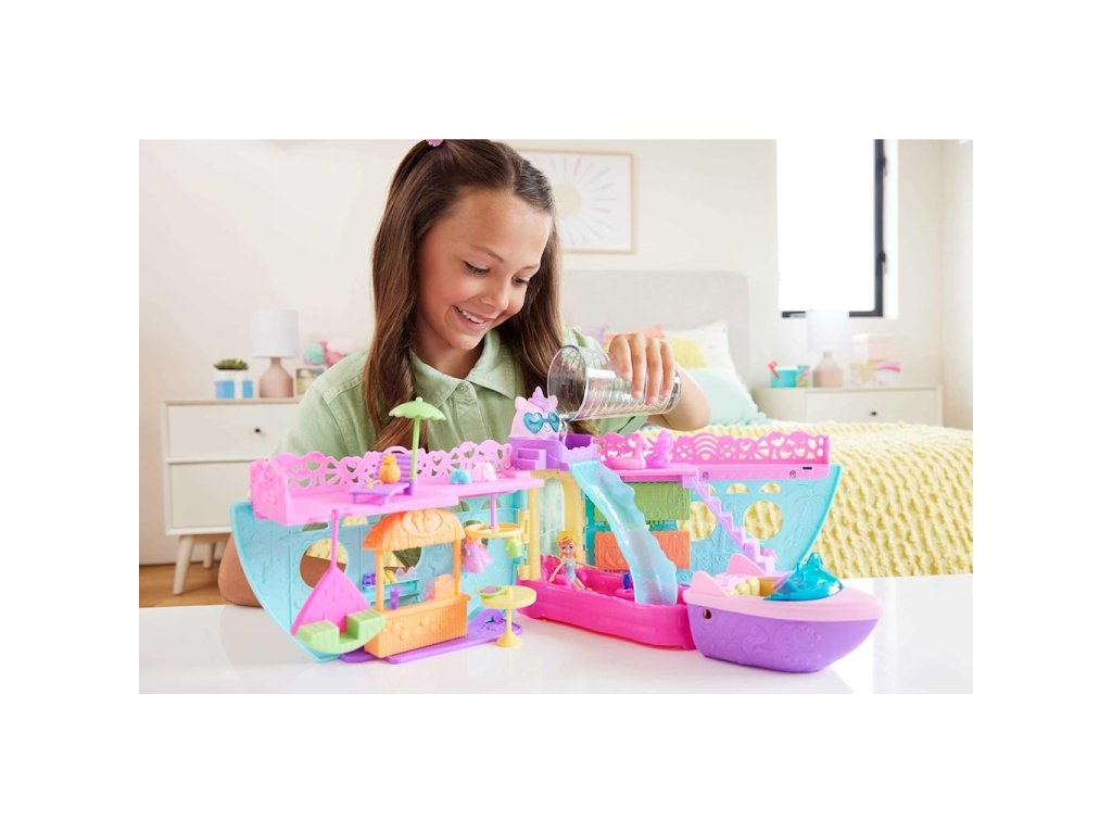 Mattel Polly Pocket Unicorn Dream Cruise Přenosný člun HWP26, Užijte si tropické dobrodružství na palubě Polly Pocket Unicorn Dream Cruise! Tato herní sada s lodí obsahuje vodní hry, otočnou skříň, jednu 7 cm panenku v plavkách s měnícími se barvami, dvě lodičky a dvě úrovně cákající zábavy! Hrací sada se otevírá a odhaluje fantastické oblasti pro hraní a aktivity, včetně tobogánu a dvou bazénů. Nalijte vodu do horního bazénu a sledujte, jak prší, aby změnilo barvu plavek pro panenku Polly – je to tak zábavné! Děti se mohou ponořit do vody a hrát si s plovákem plameňáků nebo se střídat na houpačce s melounem. Sada obsahuje také patrovou postel a slunné balkony, z nichž si Polly může užívat výhled!