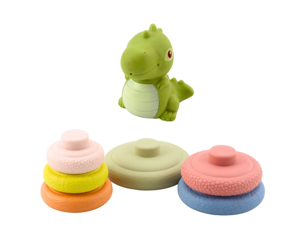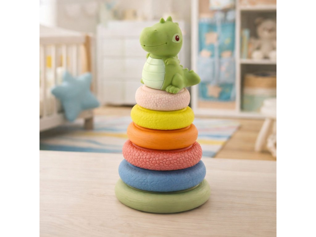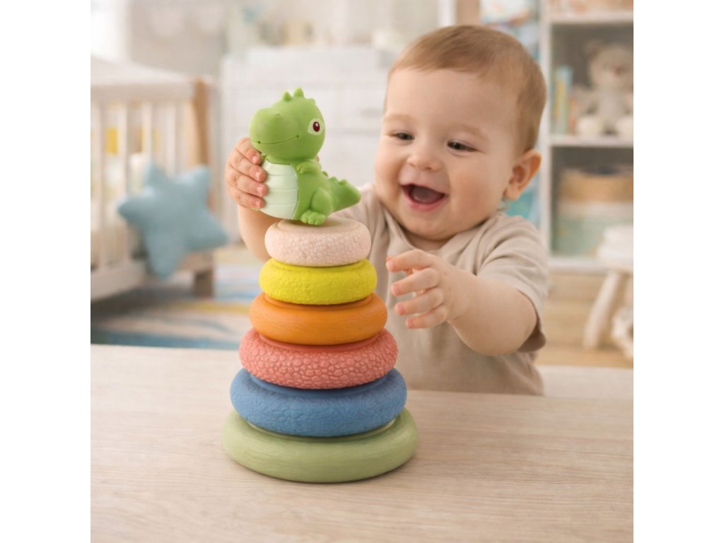 Sada se skládá ze šesti měkkých kruhů vyrobených z ekologických materiálů, každý s jinou strukturou a texturou. Různé textury poskytují dětem rozmanité hmatové podněty, stimulují hmat a kognitivní zvědavost. Skládání dílků rozvíjí manuální zručnost, koordinaci ruka-oko a logické myšlení. Dalším prvkem hračky je figurka dinosaura umístěná na vrcholu pyramidy, která po stisknutí vydává vrzavý zvuk, který podporuje interakci.