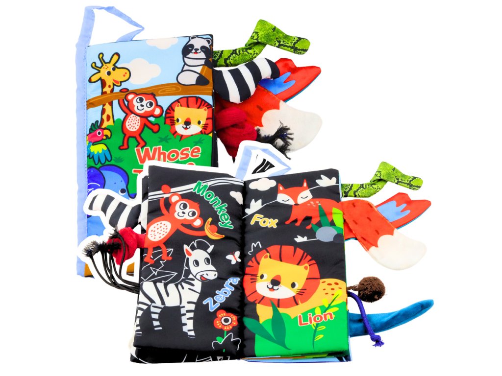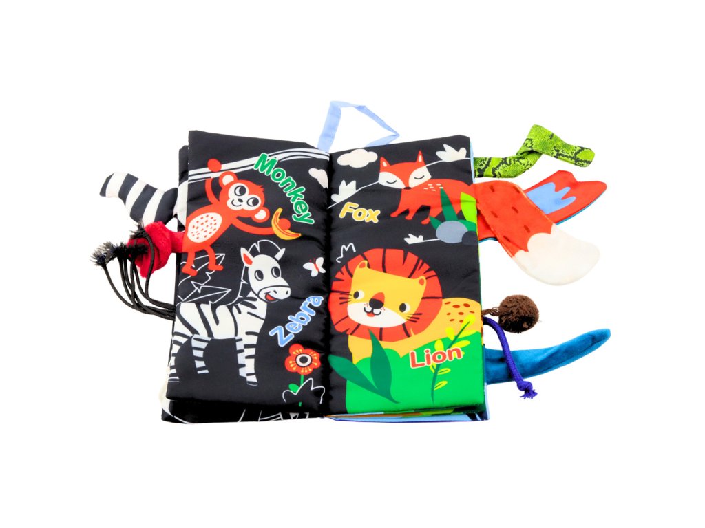 Měkká naučná knížka je ideální hračkou pro nejmenší děti, podporuje smyslový a kognitivní vývoj. Vyrobeno z bezpečných měkkých materiálů, je příjemné na dotek a bezpečné pro jemnou pokožku kojenců. Šustící stránky a vyčnívající zvířecí ocasy různých textur a barev stimulují smysly dítěte, rozvíjejí jeho zvídavost a manuální dovednosti. Barevné ilustrace zvířat, jako je zebra nebo žirafa, povzbuzují k učení a hře. Kniha je lehká a šikovná, ideální na výlet nebo na procházku.