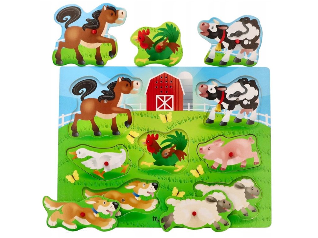 Melissa & Doug Dřevěné puzzle se zvukem - Farmářská zvířata 7 dílků 94425Toto 7dílné puzzle pro děti jistě podnítí fantazii vašich nejmenších! Když děti umístí dílek puzzle se zvířátky na správné místo na hrací ploše, uslyší zvuky, které každé zvířátko vydává! Součástí sady je sedm skvělých zvuků a barevný obrázek pod každým ze sedmi dřevěných dílků. Díly puzzle mají ideální velikost pro malé ručičky!