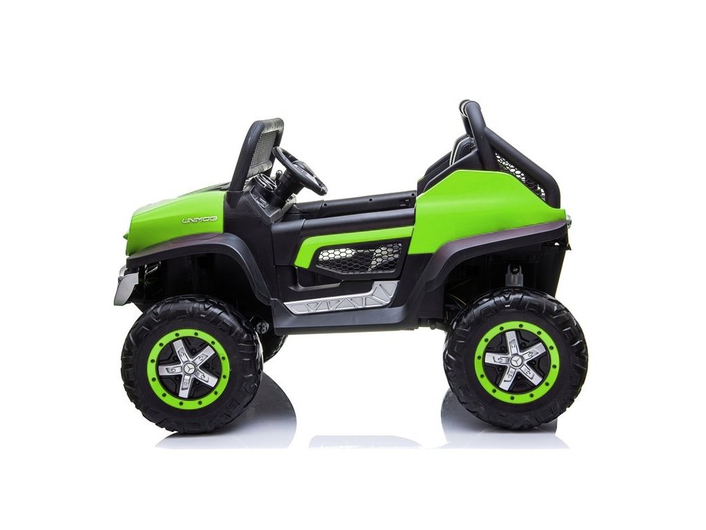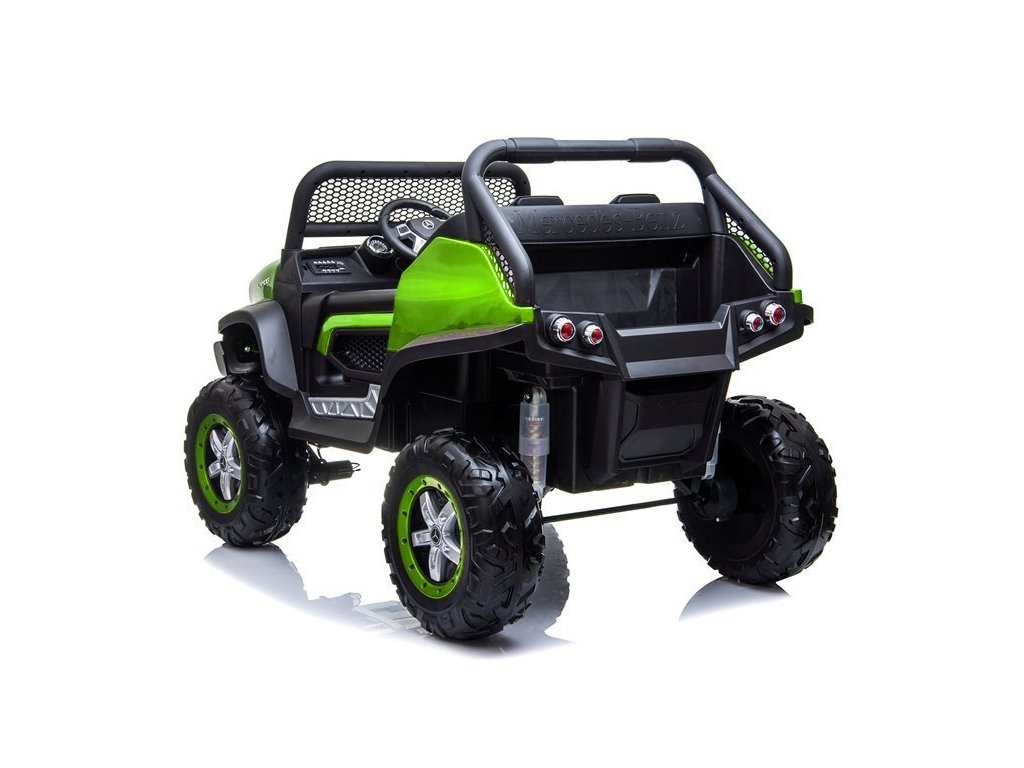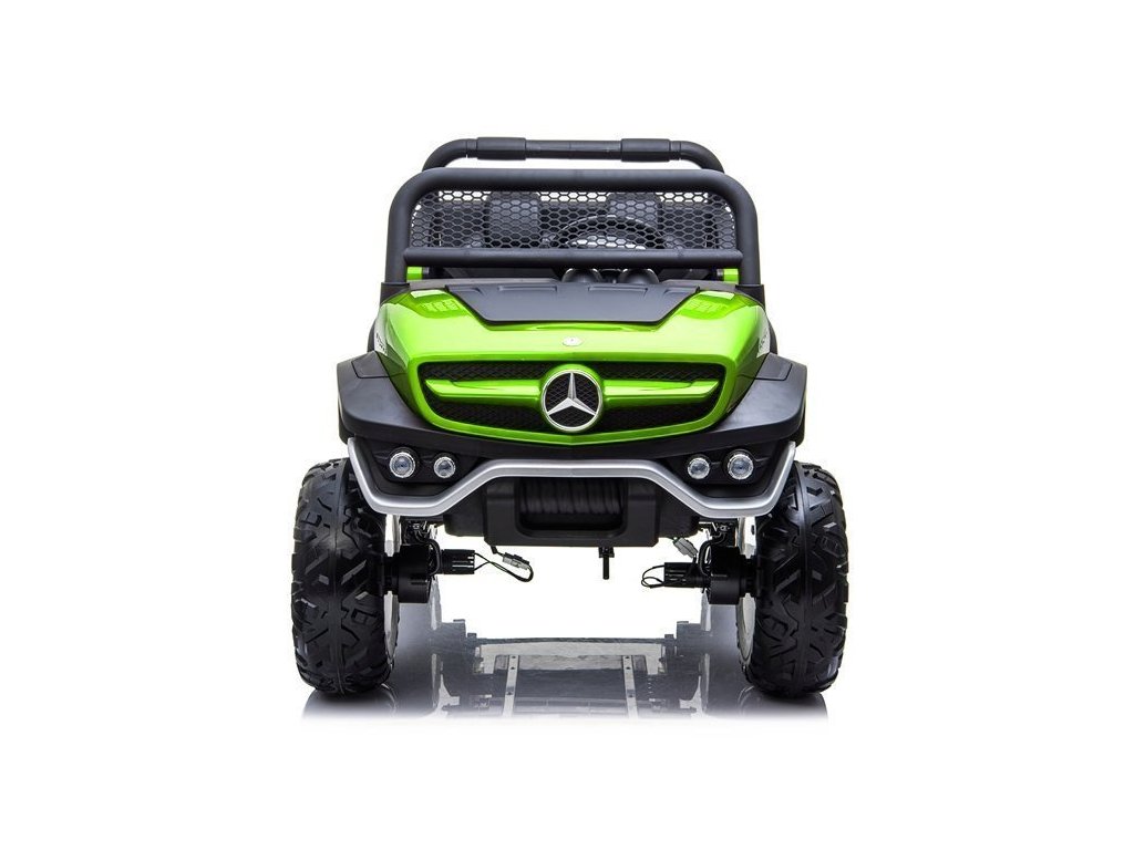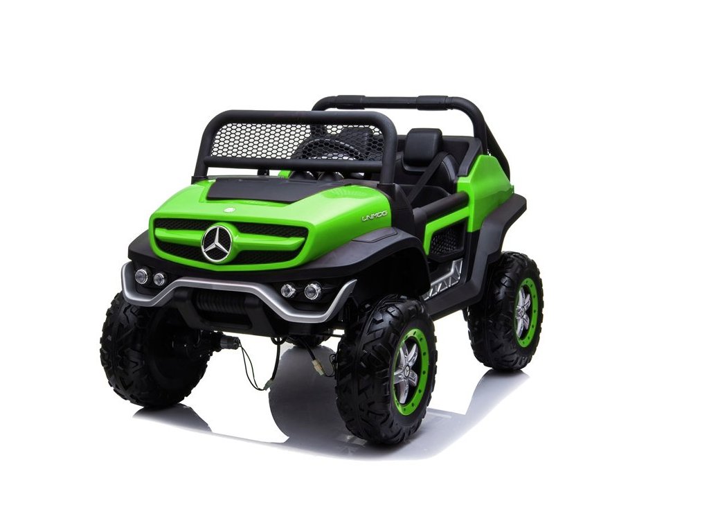 Zelený vůz Mercedes Unimog byl navržen s důrazem na nejmenší detail, což přispívá k pozitivním pocitům mladého závodníka. Odolná a masivní konstrukce v kombinaci s kvalitními materiály zajistí skvělou zábavu po mnoho let a odolnost proti poškození. Atraktivitu modelu zvyšují otevírací dveře a tlumiče, na kterých je namontován, díky čemuž je jízda po nerovném a hrbolatém terénu mnohem příjemnější a dobrodružnější. Toto dětské auto na baterie jistě splní očekávání mladých motoristických fanoušků. Proč? Za pozornost stojí jeho reálné provedení, motor 4x45W, baterie 12V14Ah.