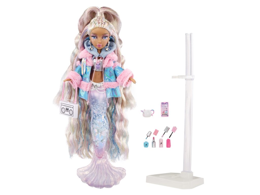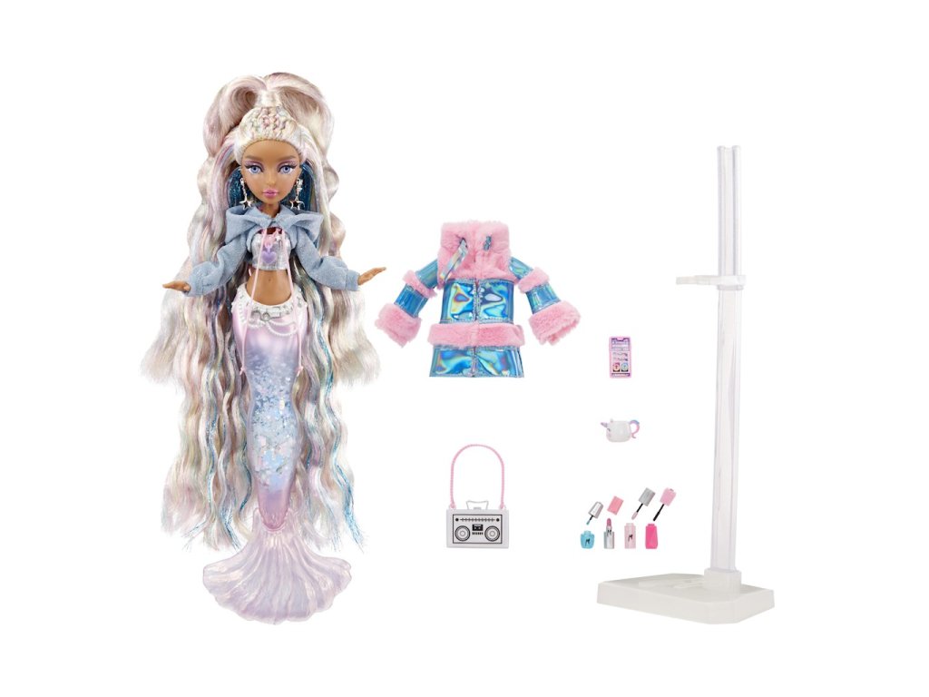 Mermaze Mermaidz Kishiko panenka mořské panny měnící barvu 585435Každá panenka Mermaze Mermaidz Winter Waves má okouzlující ocas plný třpytek. Kishiko má třpytivého jednorožce! Několikrát s ní zatřeste nahoru a dolů, abyste viděli, jak se třpytky víří! Kishiko má unikátní, speciálně tvarovanou ploutev, která magicky mění barvu, když se ponoří do ledové vody. Její ploutev se mění z perleťově růžové na růžovo-modrou! Kishiko má na sobě metalický top a mikinu s dlouhým rukávem a duhovou bundu s růžovou kožešinou. Mezi její doplňky patří dlouhé hvězdicové náušnice, náhrdelník a kabelka přes rameno inspirovaná kazetami.