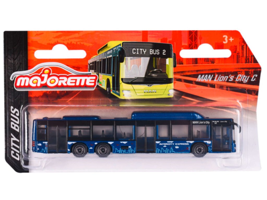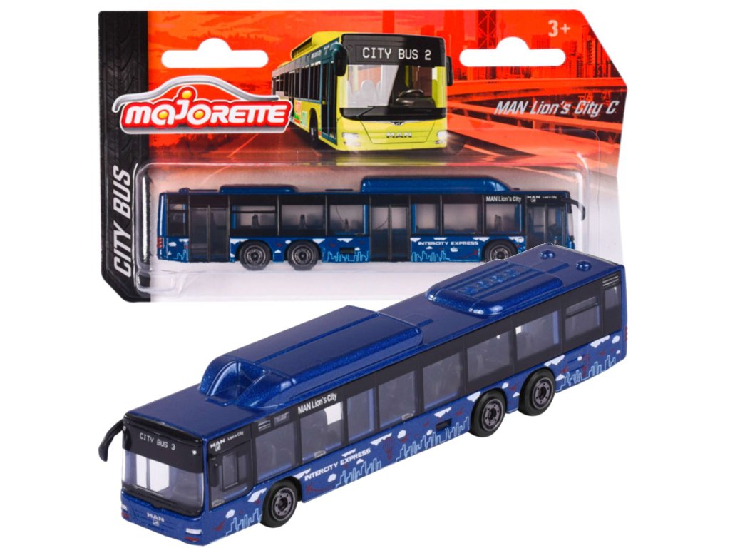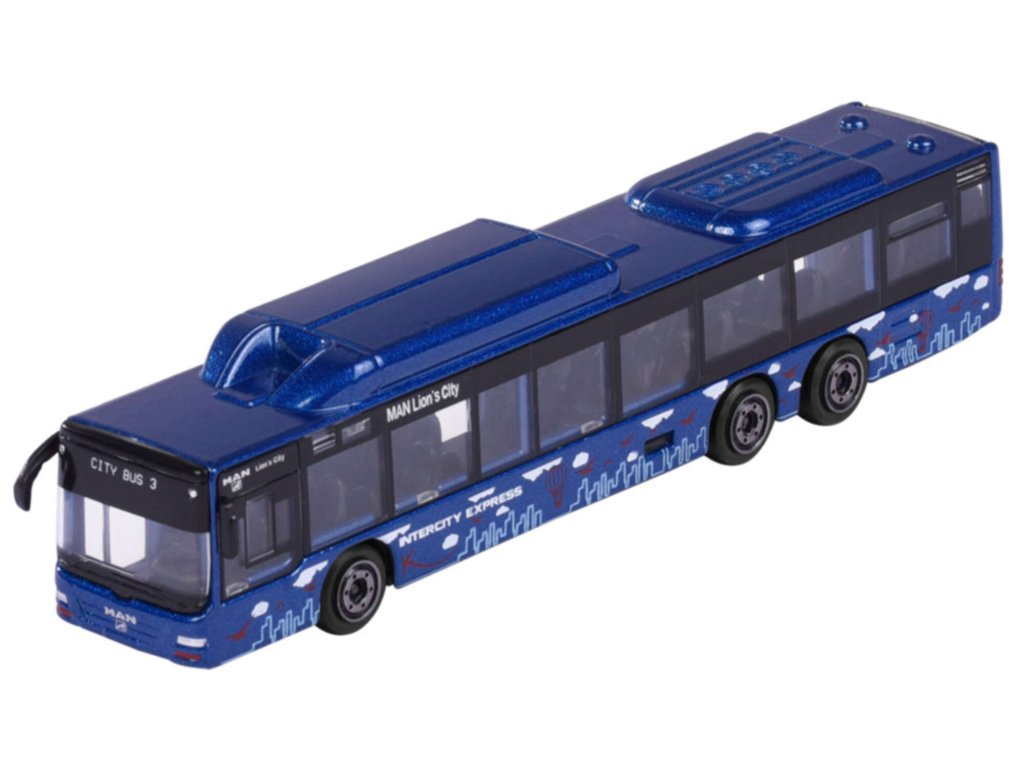 Městský autobus MAN je tmavě modrý s barevnými prvky a nápisem „Intercity Express“ Je vyroben z kovu a částečně z plastu, který mu umožňují pohyb po površích plochá.Hračka byla vytvořena s důrazem na detail Zajisté potěší všechny malé i velké motoristické nadšence a může se stát i cenným doplňkem jejich sběratelské police.