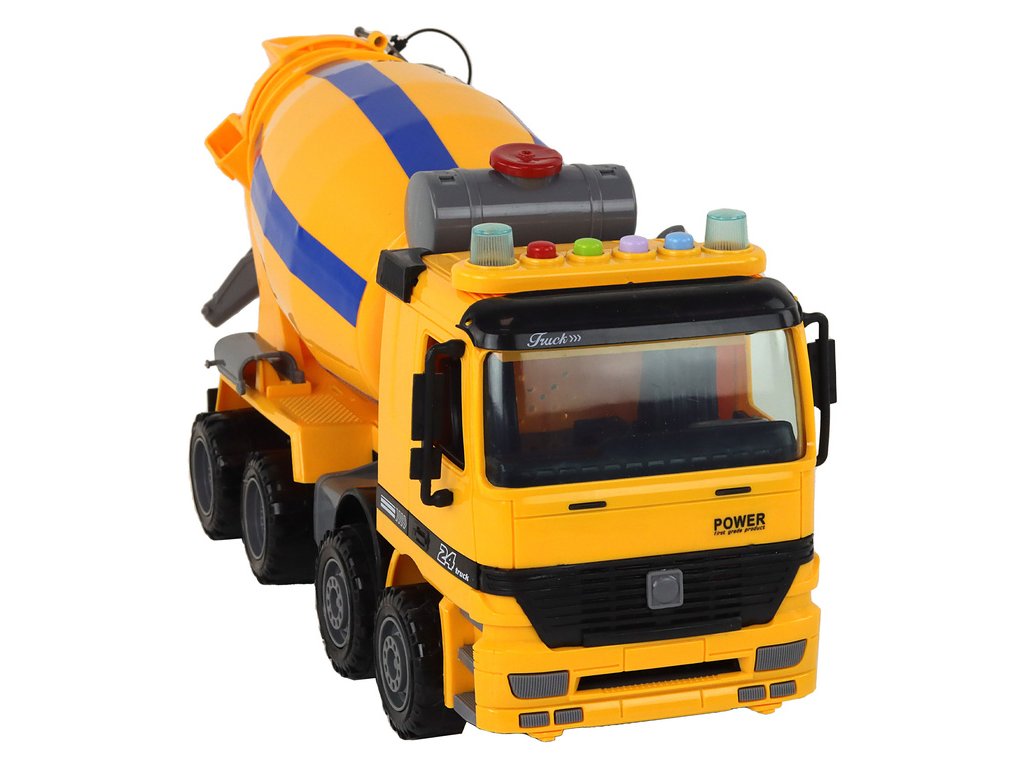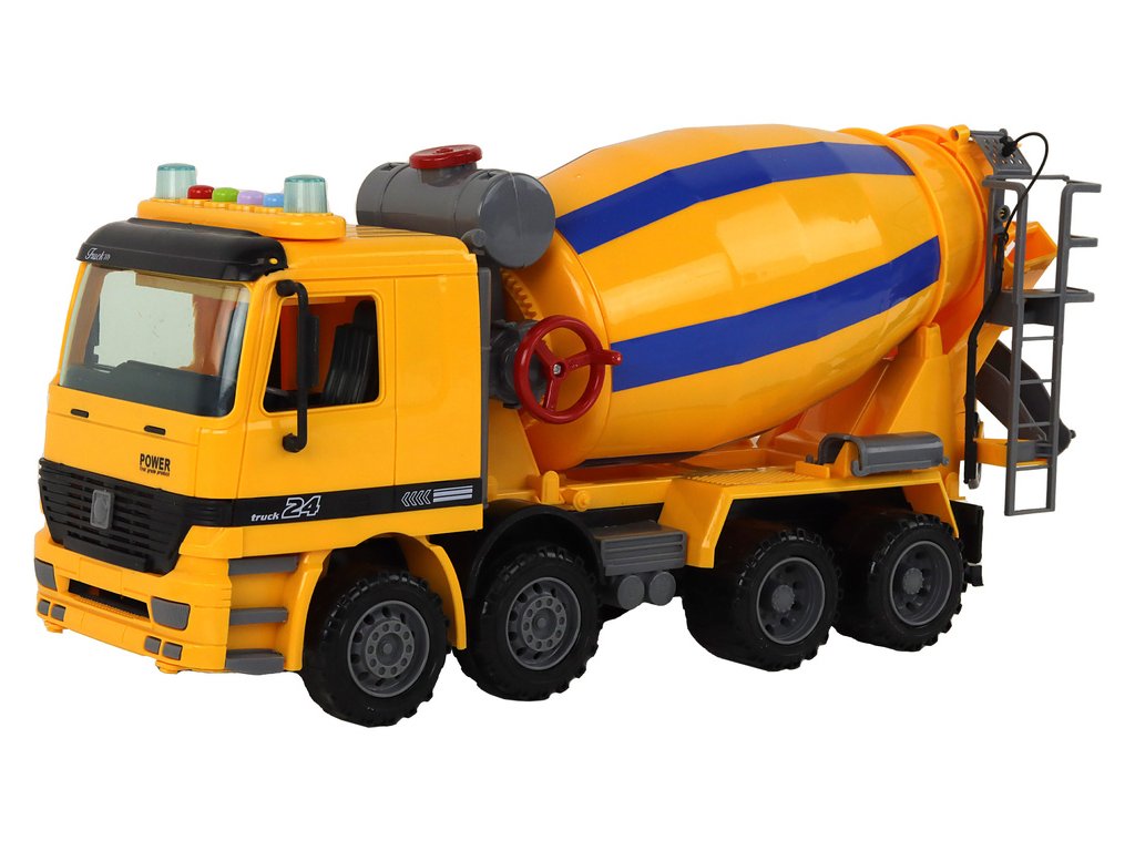 Míchačka na beton oranžová rotační hruška zvuková světla stavební vozidlo