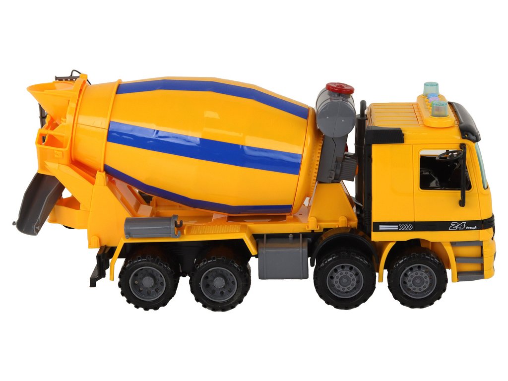 Míchačka na beton je natřena žlutou a modrou barvou, což jí dodává atraktivní a výrazný vzhled. Díky realistickým detailům hračka připomíná skutečnou míchačku betonu, což jistě zvyšuje její přitažlivost pro děti.