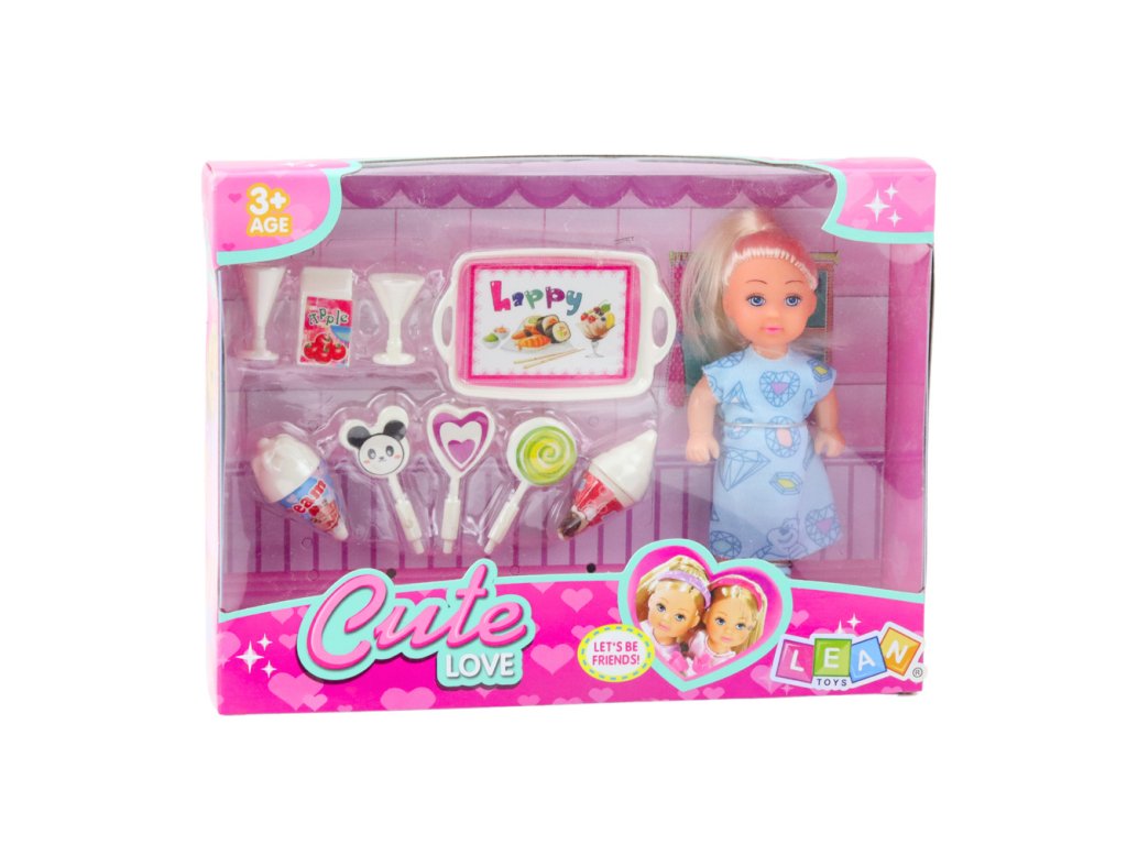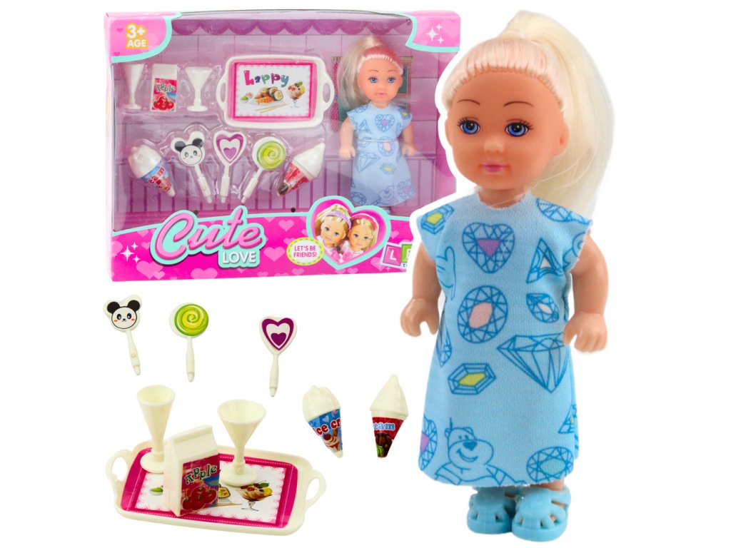 Sada s panenkou a sladkými doplňky je skvělou variantou pro děti, které milují kreativní hru a hraní každodenních scén. 12 cm vysoká panenka je oblečená v modrých šatech s roztomilými potisky a součástí sady jsou tematické doplňky – lízátka, zmrzlina, kornouty a tác s občerstvením – které nejen zpestřují hru, ale také podporují rozvoj dětské fantazie, manuální dovednosti a sociální dovednosti.