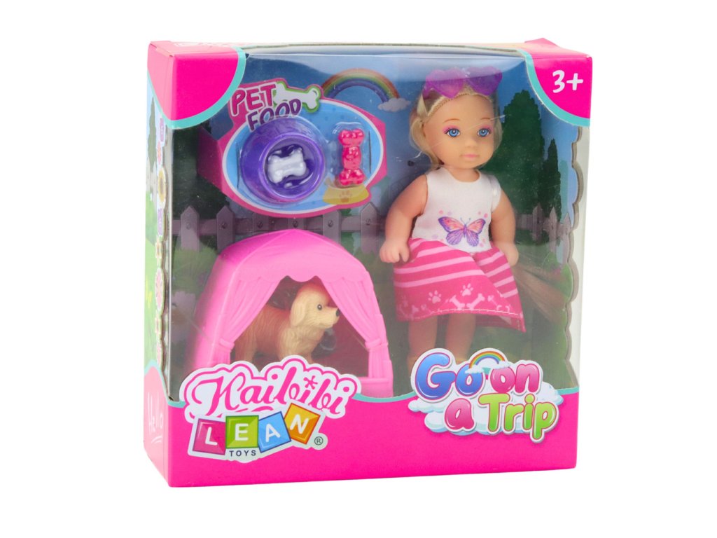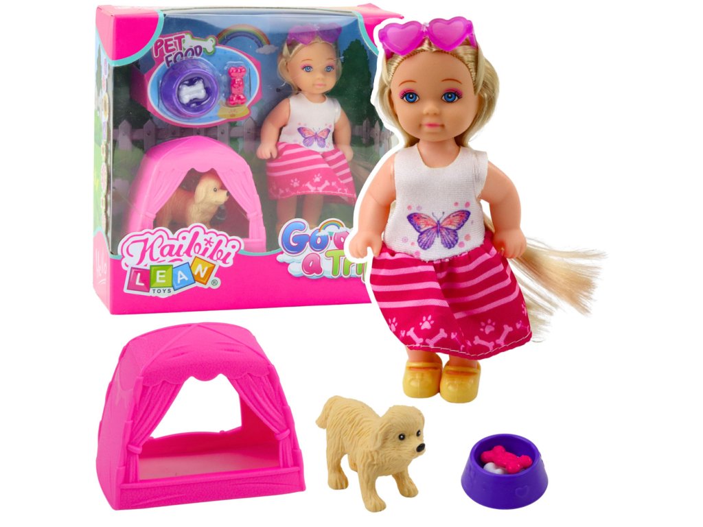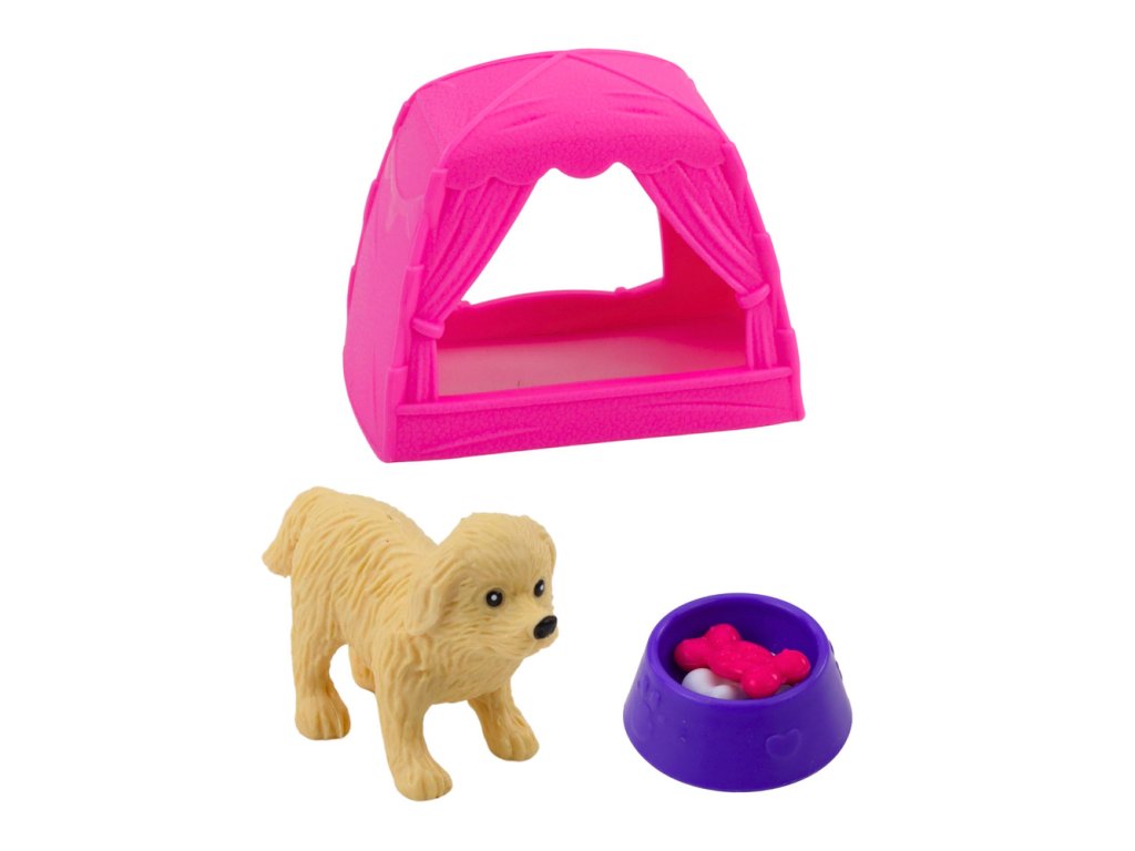 Sada obsahuje malého pejska – věrného společníka panenky, který potřebuje péči, krmení a místo k odpočinku. Speciálně navržený růžový stan slouží jako bouda pro psy – ideální pro odpočinek, hraní nebo spaní. Sada obsahuje také misku s kostí a pamlskem, umožňující krmení a realistické hraní rolí.