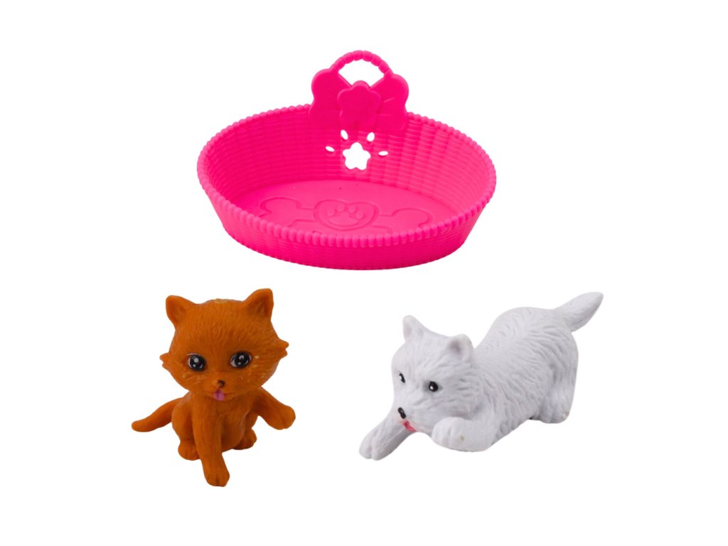 Mini panenka set se psem a kočkou, postelí a miskou na jídlo
