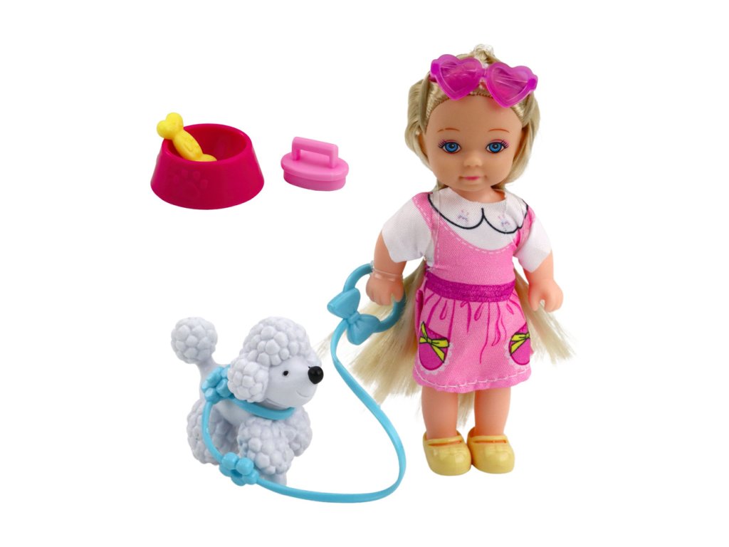 Panenka Mini Dog je okouzlující sada, která zavede děti do světa každodenní péče o domácí mazlíčky. Sada obsahuje 12 cm vysokou panenku oblečenou v elegantních růžových šatech s potištěnými kapsami a bílým límečkem. Vzhled doplňují žluté botičky a růžové brýle ve tvaru srdce posazené na hlavě panenky. Její dlouhé blond vlasy a přátelský vzhled z ní dělají dokonalou parťačku.