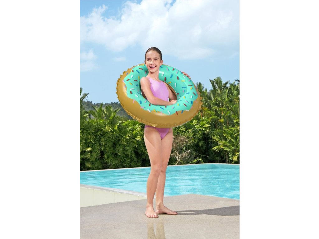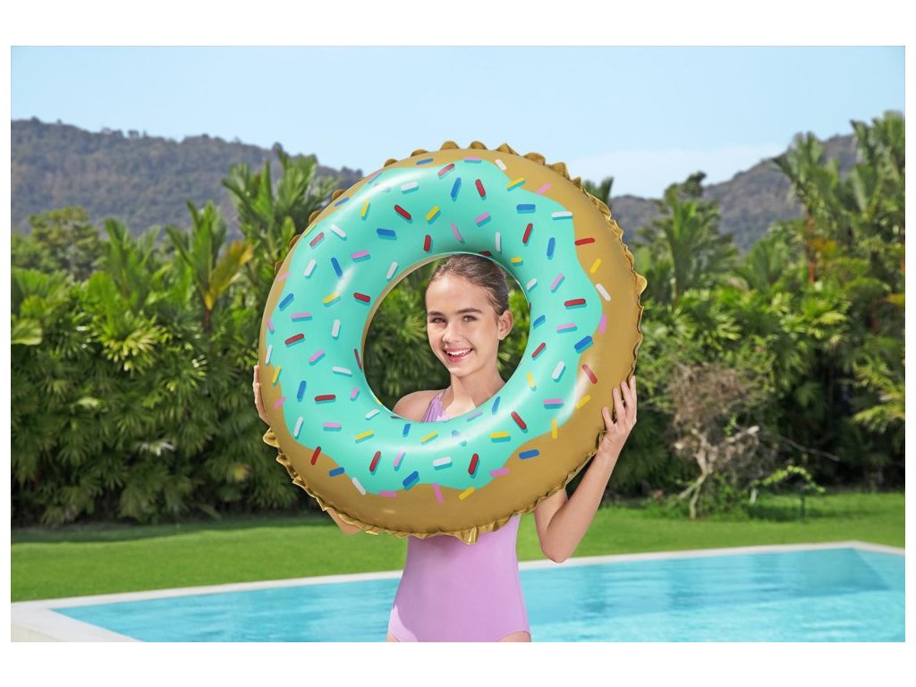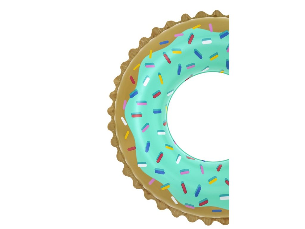 Prázdninové plavecké doplňky začínají nabývat stále zajímavějších tvarů a vzorů. Pokud vám klasické nafukovací kolečko na plavání nestačí, pořiďte si kolečko s motivem sladkého donutu. Svým vzorem vás zviditelní na pláži nebo koupališti. Její průměr je 91 cm a je vyrobena z odolného PVC materiálu. Je určen pro všechny osoby starší 10 let. Kolo je pohodlné a na vodě zůstává stabilní. Je vyrobena z odolného PVC materiálu odolného proti zničení