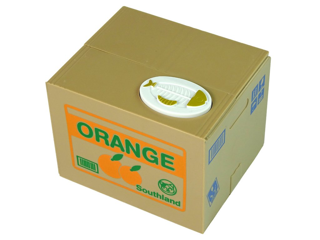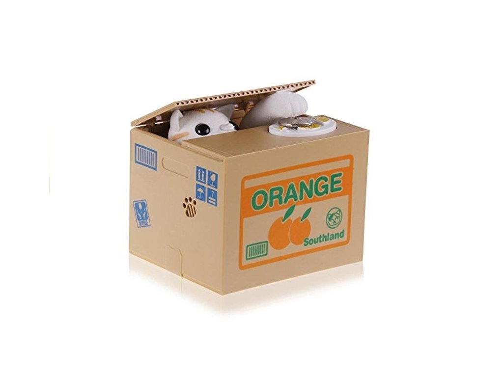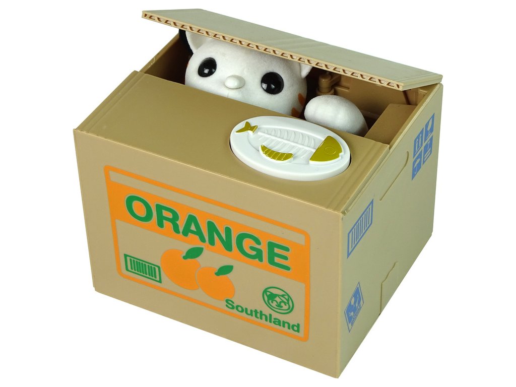 Stiskněte tlačítko na budce a kočka zvedne víko a tlapkou vytáhne peníze.