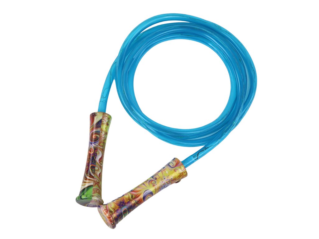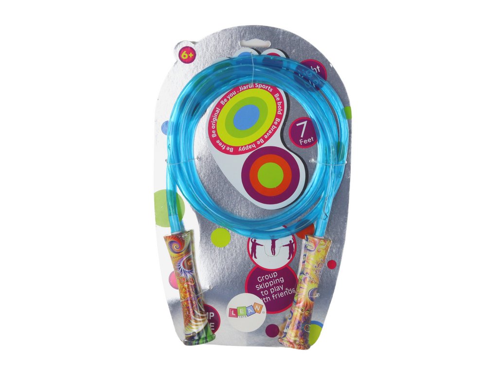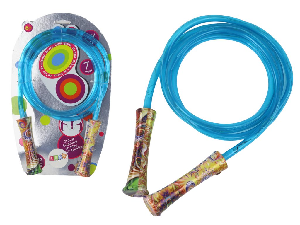 Švihadlo se vyznačuje modrým světýlkem, které svítí podél jeho struny, když stisknete tlačítko na jedné z rukojetí. Rukojeti jsou zdobeny barevnými vzory, které dodávají estetiku a veselý charakter.