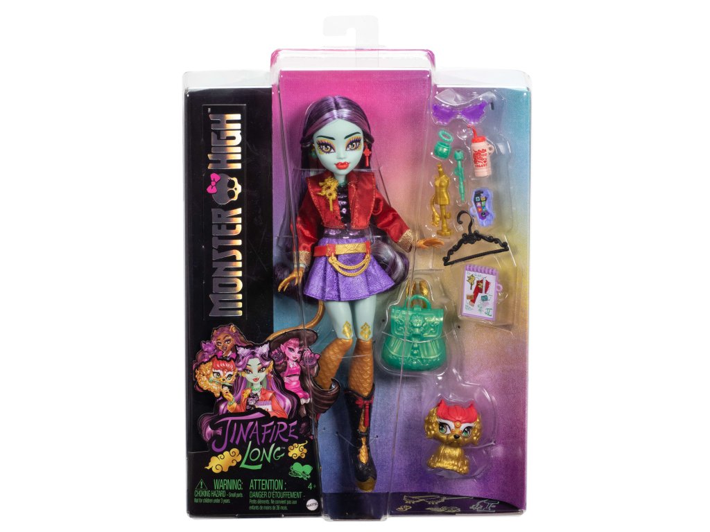Panenka Monster High Jinafire Long je rozkošná, stylová a temperamentní dračice ovládající počasí. Jinafire Longmiluje módu.Její nápadný top a sukně s ohlávkou jsou zdobeny potiskem mraků a dokonale ladí se zkráceným sakem. Panenka má krásné tyrkysově hnědé oči a dlouhé černofialové vlásky.