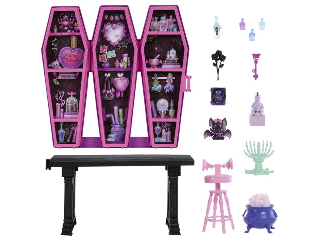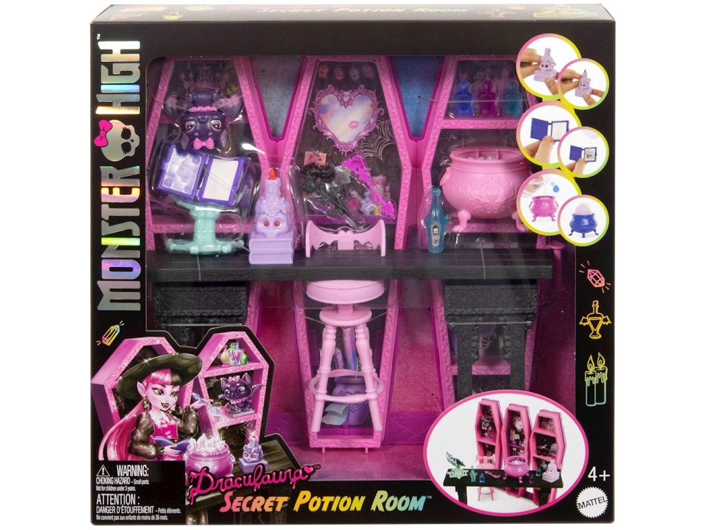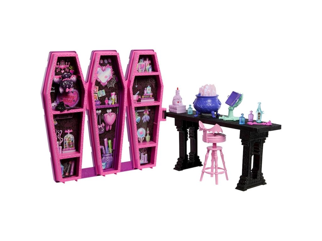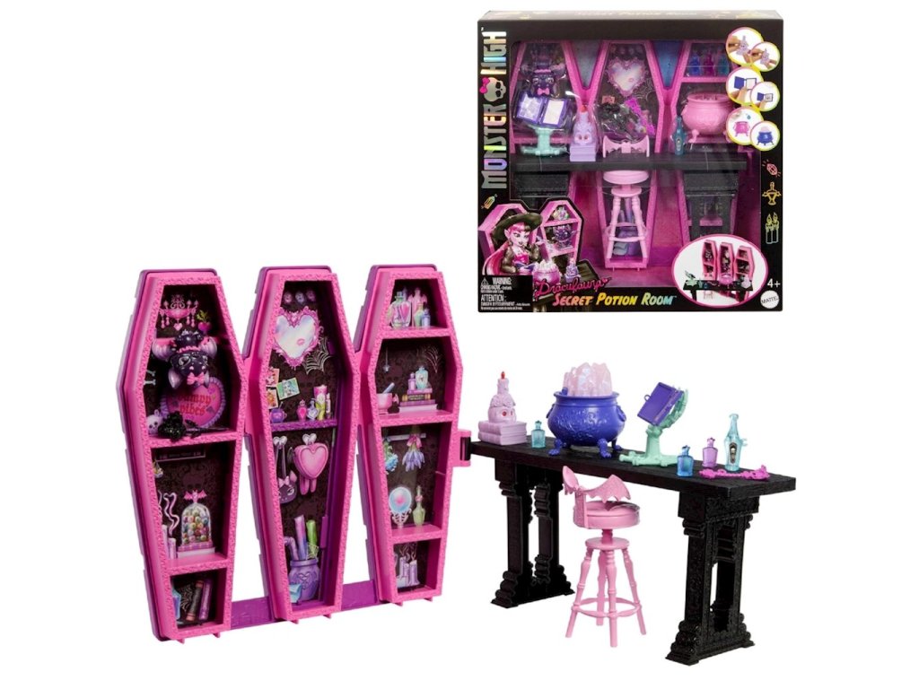 Tajná lektvarová místnost Monster High Draculaura + příslušenství JBF15Sada Tajná lektvarová místnost Monster High má vše, co si mladá čarodějnice může přát! Obsahuje fantastický nábytek a spoustu vyprávěcích doplňků pro skvělou zábavu. Přidejte k zábavě trochu magie! Sada je plná překvapivých proměn – od knihy kouzel s mizející stránkou až po kotlík, který mění barvu. Součástí sady je také Dracularův nádherný netopýr - Count Fabulous. Panenka není součástí.