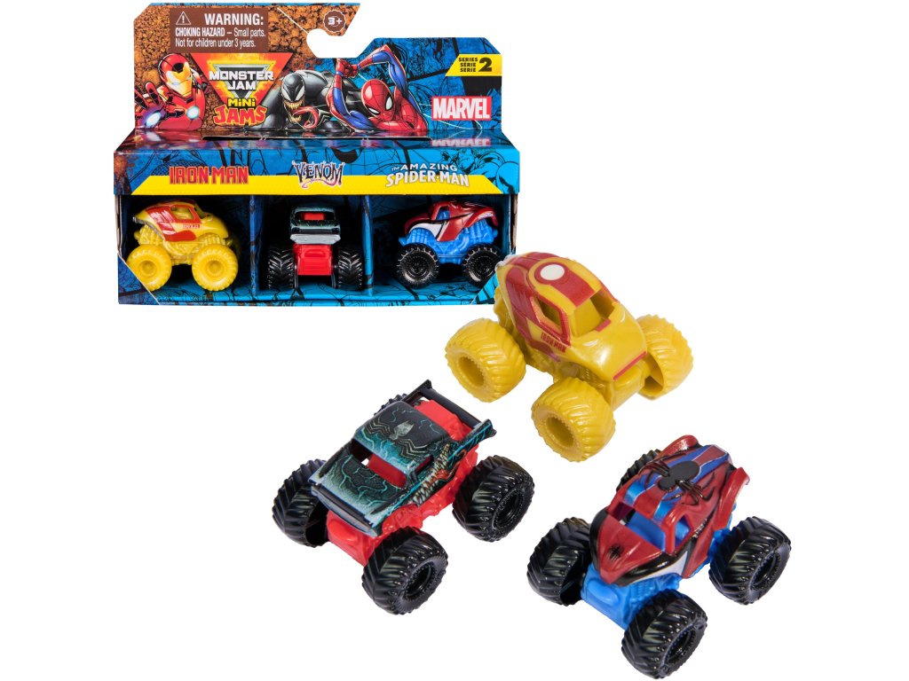 Monster Jam se setkává se světem Marvelu! Sady Marvel Monster Jam 3 v 1 jsou jedinečnou kombinací vzrušení z arén Monster Jam a síly vašich oblíbených superhrdinů Marvelu. Tato sada obsahuje vozidla inspirovaná: Iron Man, Venom a Spiderman .