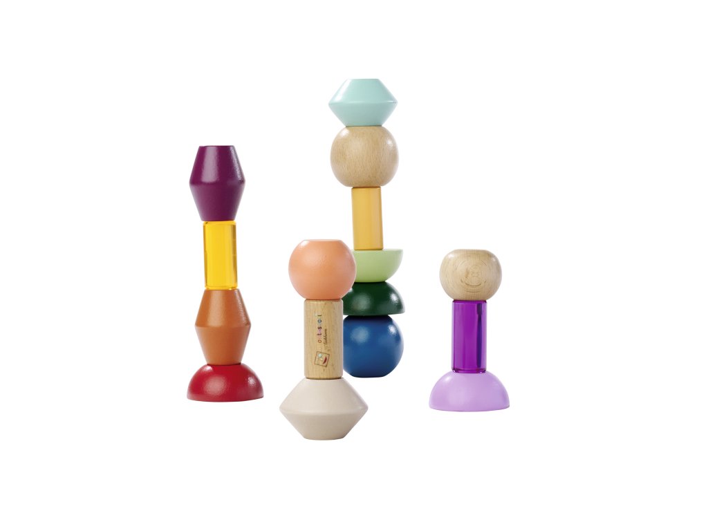 Toto dřevěné puzzle se skládá z 16 barevných dílků, které lze použít k vytvoření extrémně vysoké věže nebo několika menších. Každý dílek má ploché části, aby bylo jeho skládání ještě snazší.