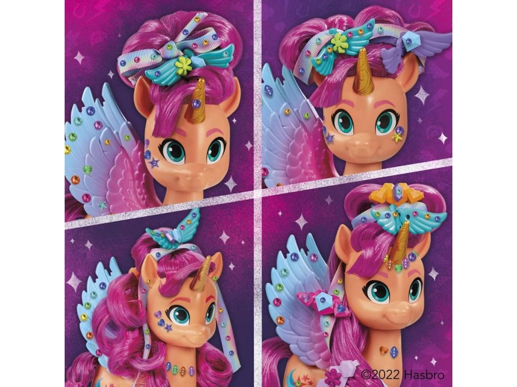 Sunny Starscout. Zvědavá, dobrodružná a odhodlaná změnit svět k lepšímu.Sada poníka Sunny s módní stuhou je stylový balíček pro dívky, které chtějí zkrášlit a stylizovat své My Little Pony. Pomocí doplňků si můžeš vytvořit nápadité účesy se zakomponovanou duhovou stuhou nebo originální účesy. Ozdob Sunnyiny dlouhé, snadno upravitelné vlasy krystalky, sponkami a samolepkami! K dispozici je spousta módních vychytávek! Vytvářejte jedinečné účesy pomocí dvou nástrojů na účesy! Děti mohou pomocí těchto sponek vytvářet zábavné updaty ve vlasech a hřívě samotné Sunny. Rozčesej Sunny vlasy, vytvoř jí účes jako z jiného světa a ozdob si koníka samolepkami, abys přizpůsobil vzhled svého alicorna. Nyní se pochlubte svým kamarádům!