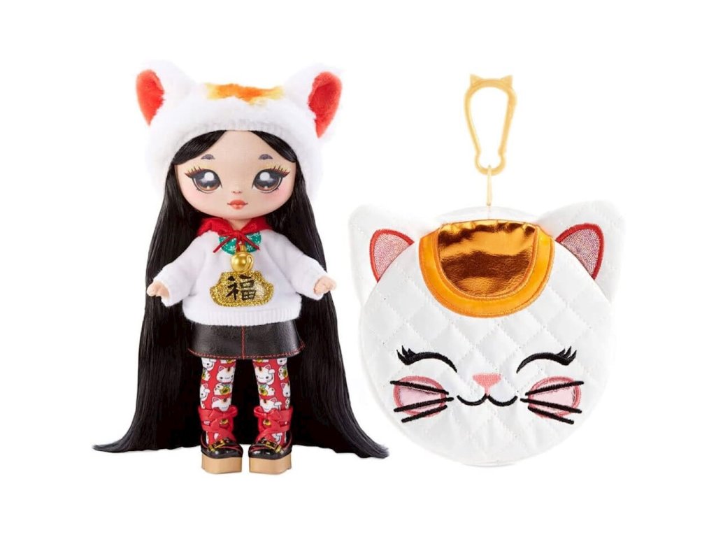 Ne! Na! Na! Surprise Glam Luna Luck Kitty Doll 579274Na!Na!Na! Surprise přichází se svou druhou sérií roztomilých a měkkých módních panenek 2 v 1. Tentokrát tato série obsahuje 5 sběratelských sad, z nichž každá má skvělý styl, doplňky a tašku ve tvaru zvířete s kouzlem. V této sadě vaše dítě najde Liling Luck. Má velmi dlouhé černé vlasy a styl inspirovaný japonskou šťastnou kočkou, o čemž svědčí mimo jiné vtipné punčocháče s potiskem, nadýchaná čepice s kočičíma ušima a svetr s japonskými znaky.