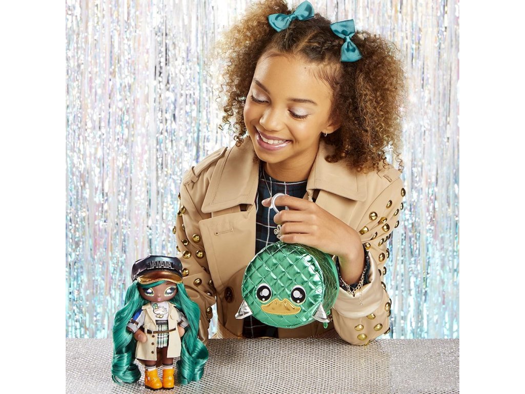 Pro 2-v-1 Na!Na!Na! Surprise je kromě panenky dodávána i s taškou. Zobrazuje hlavu okouzlující zelené kachny. Taška má také kovový přívěsek na připevnění. Díky tomu ji dítě může nosit s batohem, páskem u kalhot nebo větší kabelkou. Do tašky se vejde panenka Mallory Duckington nebo různé další věci, které bude chtít mít vaše dítě u sebe. Zapíná se i na zip, takže nic nevypadne.