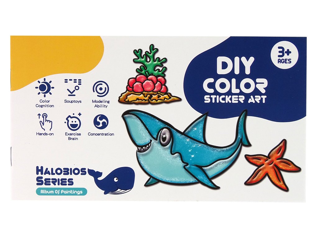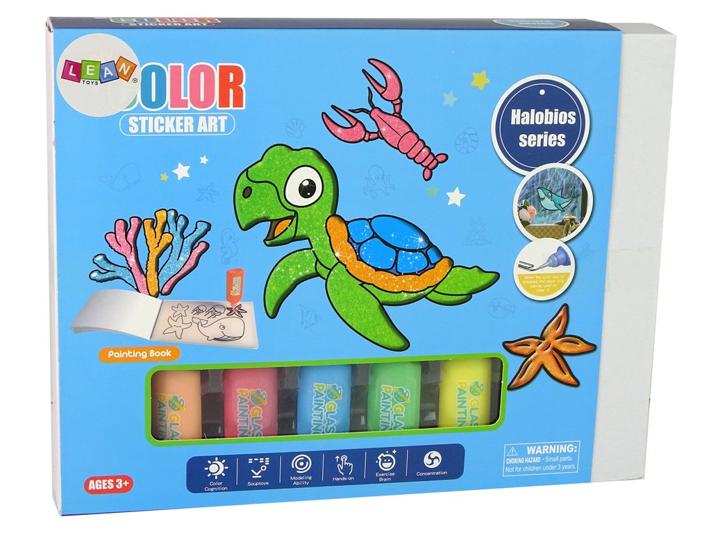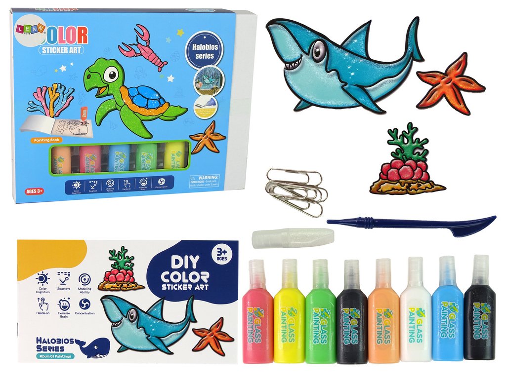 Sada obsahuje různé samolepky, které připomínají mořské živočichy, jako je želva, žralok, hvězdice a korálový útes. Vaše dítě bude mít možnost si výrobek namalovat dle vlastní fantazie. Samolepka má pouze okraj, výplň je na vás. Přiložených 8 barev a třpytek způsobí, že se samolepky na skle třpytí a třpytí.