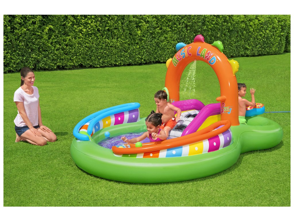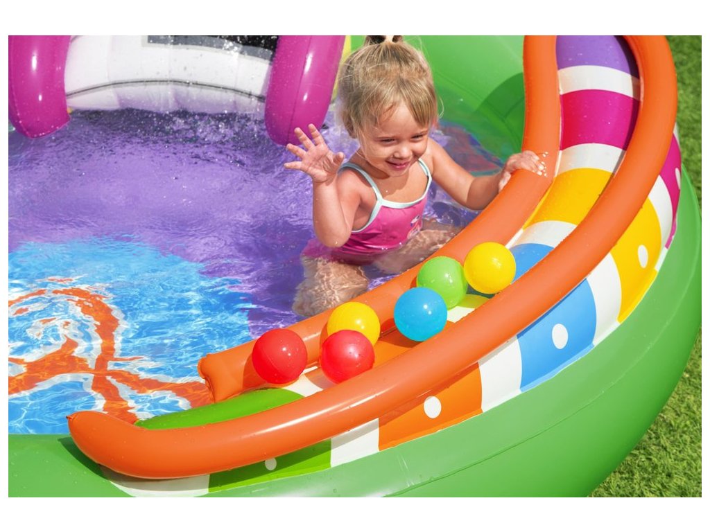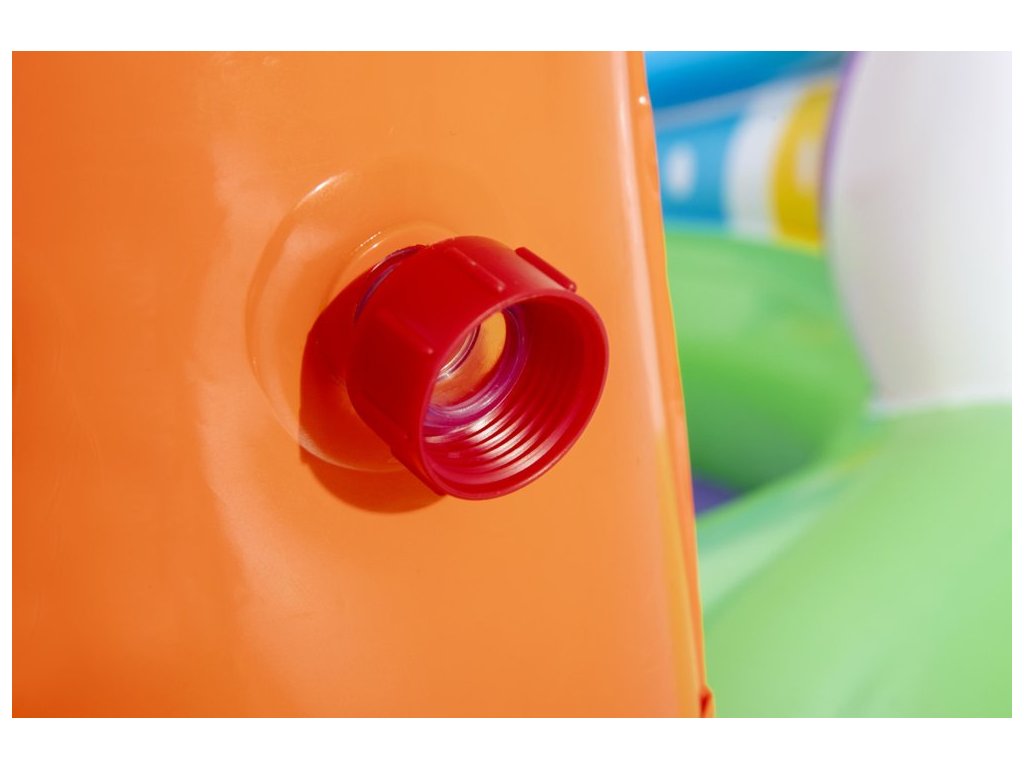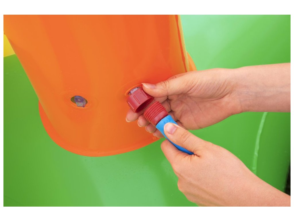 Rádi byste svému dítěti dopřáli nezapomenutelnou zábavu v soukromí vaší zahrady? Nafukovací hřiště z něj udělá skutečné centrum zábavy pro vaše dítě. Bazén s nafukovacími atrakcemi jako je nafukovací skluzavka, vodní fontána jistě potěší vašeho nejmenšího a stane se jeho oblíbeným místem na hraní. Bazén je vyroben z měkkého, ale odolného materiálu a je maximálně bezpečný pro nejmenší děti. Hlavní atrakcí je nafukovací skluzavka a oblouk, ze kterého po napojení na zahradní hadici poteče voda. Hřiště může využívat více dětí současně, díky četným atrakcím si každé z nich najde to své.