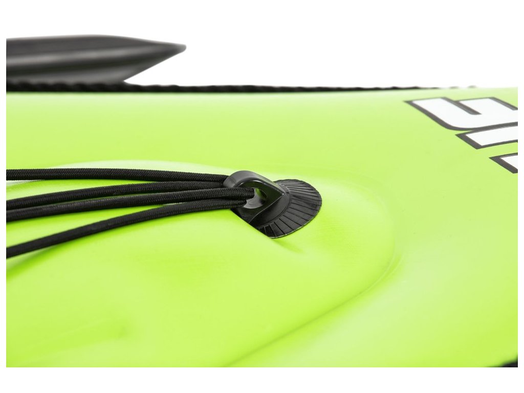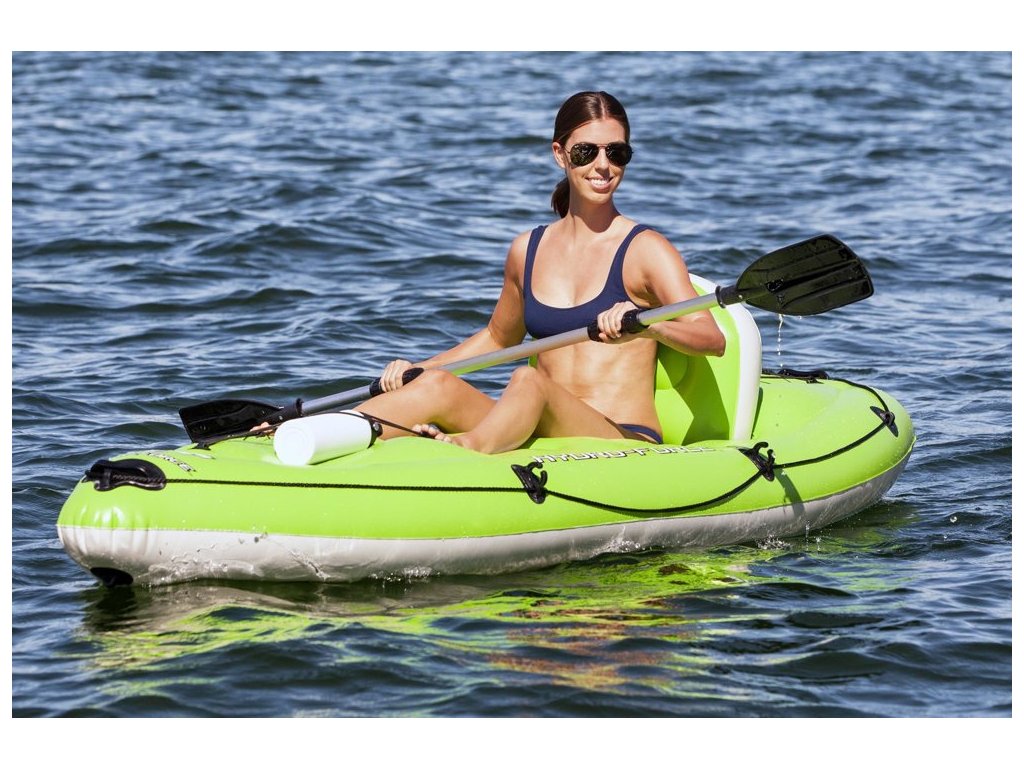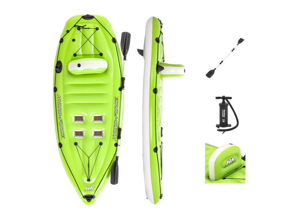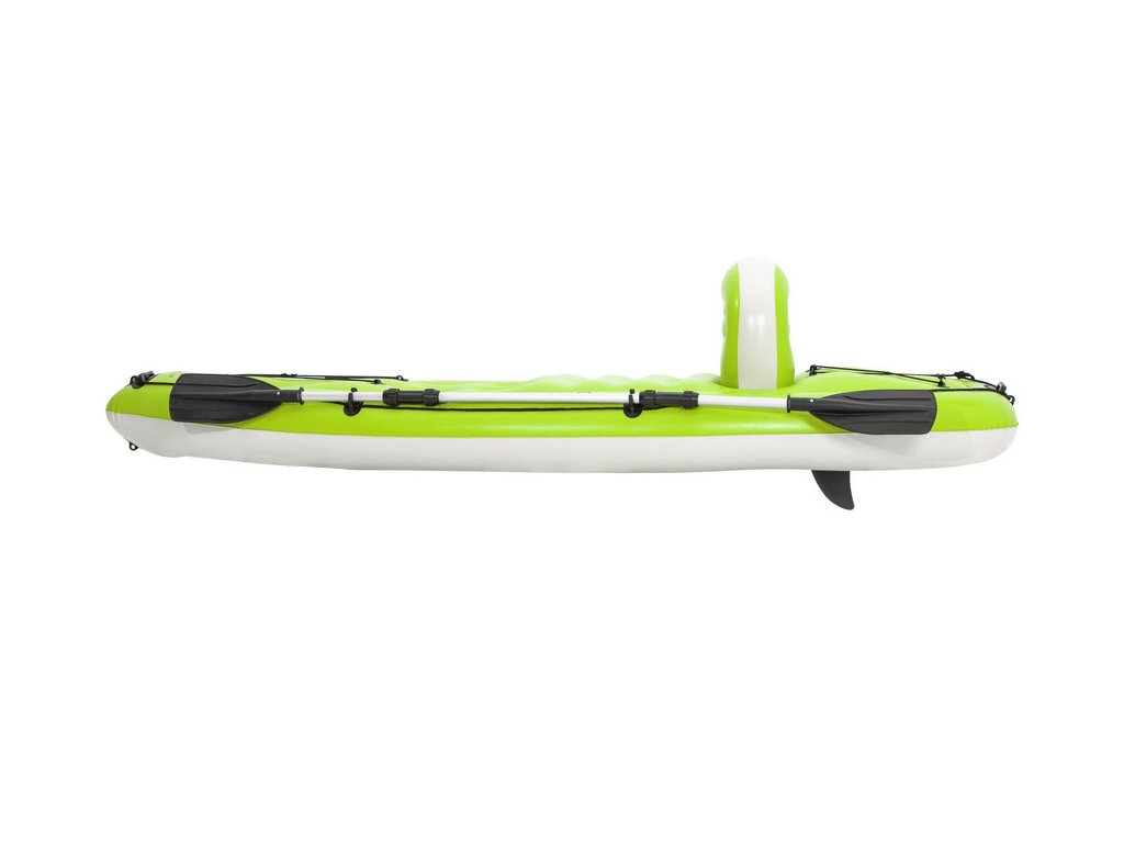 Výlet k vodě je ideální formou trávení volného času. Pro zpestření této bezstarostné chvíle se vybavte doplňkovým bazénovým příslušenstvím. Kajak je určen pro rybolov na vodě. Skvěle se hodí i na rekreační výlet po jezeře nebo koupališti. Byl vyroben z odolného vinylu odolného proti poškození. Nyní můžete pohodlně lovit, doplněný o vestavěný držák rybářského prutu a zámky na vesla. Kajak má také nafukovací opěradlo pro maximální relaxaci a 4 stupačky pro přizpůsobení uživatelům všech velikostí. Ideální pro přepravu a kompaktní skladování. Hřbetní ploutev je navíc odnímatelná, což ještě více usnadňuje skladování tohoto kajaku. Tato sada také obsahuje ruční pumpu Air Hammer™ pro jednoduché a rychlé nafouknutí, pádlo a záplatu na opravu.