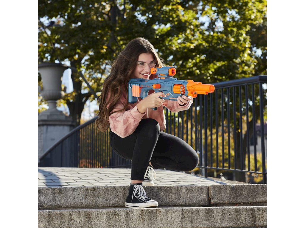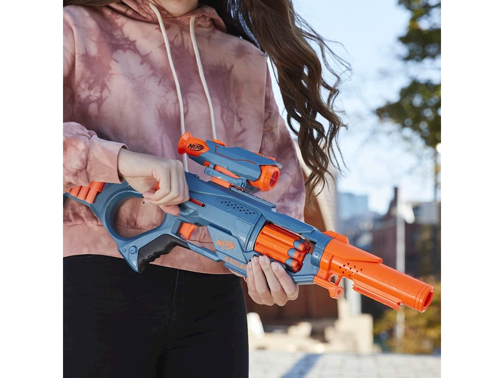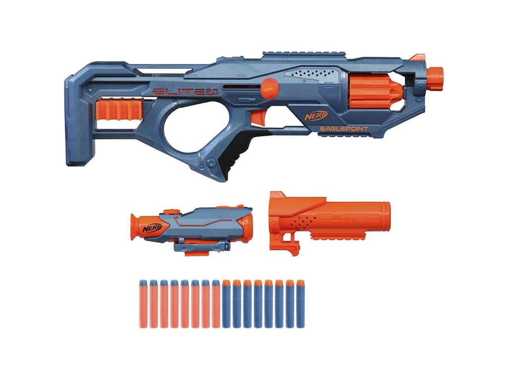 Šikovný, akční a připravený k úpravám, to je nový odpalovač Nerf Elite 2.0 EaglePoint! Eaglepoint je vystřelovač vybavený otočným bubnovým zásobníkem na 8 šípů. Nepotřebuje baterie a díky praktické rukojeti ji můžete během chvilky nabít a vystřelit jednu ránu nebo celý náboj. Kromě toho má vystřelovač pažbu, do které lze uložit dalších 8 šípů, připojitelnou hlaveň a zaměřovač. Eaglepoint má tři taktické lišty, z nichž jedna je umístěna na horní straně odpalovacího zařízení, druhá pod zásobníkem a třetí na připojeném prodloužení hlavně. Eagelpoint má také velmi dobrý dosah. Šípy vystřelené z odpalovacího zařízení mohou zasáhnout cíl až z 27 metrů!Funkce spouštěče: