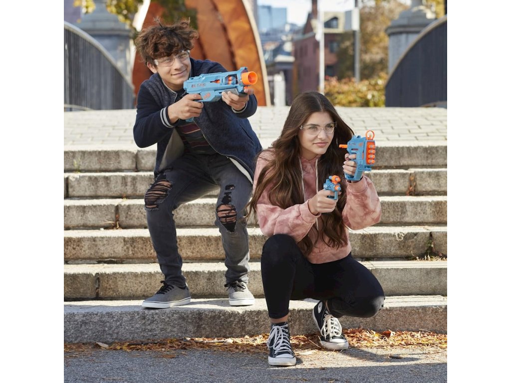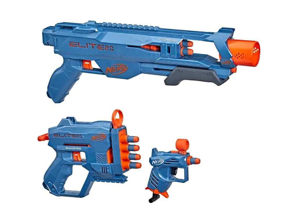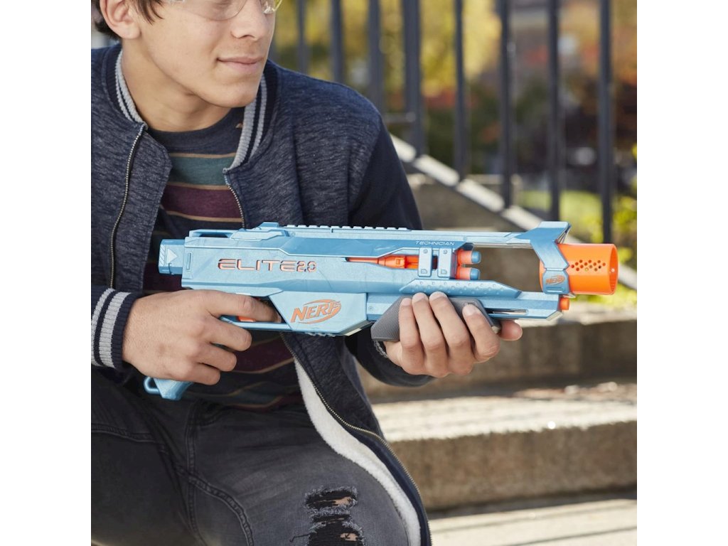 • Zbraň Nerf Elite 2.0 TEHCNICIAN DS-2 - tento odpalovač vystřelí 2 šipky za sebou. Je kompatibilní s odnímatelnými ramenními pažbami. Na horní straně je jedna taktická lišta a na patě rukojeti je závěsný bod.