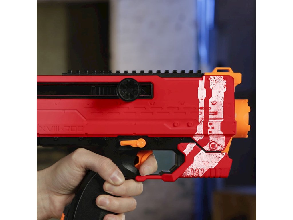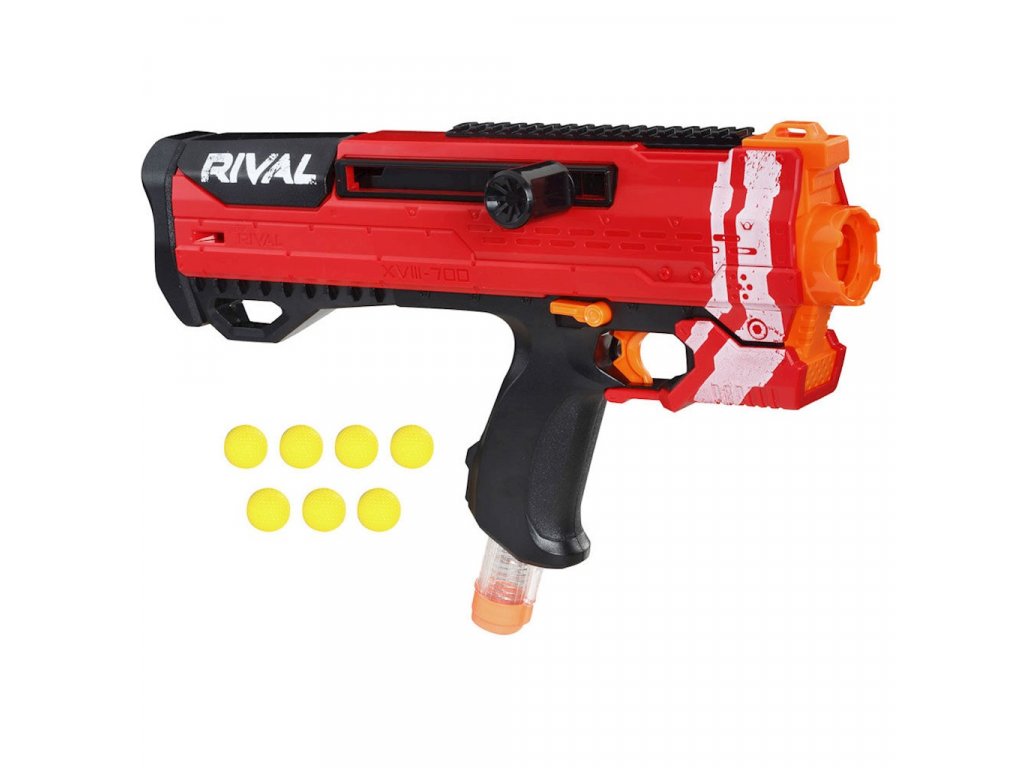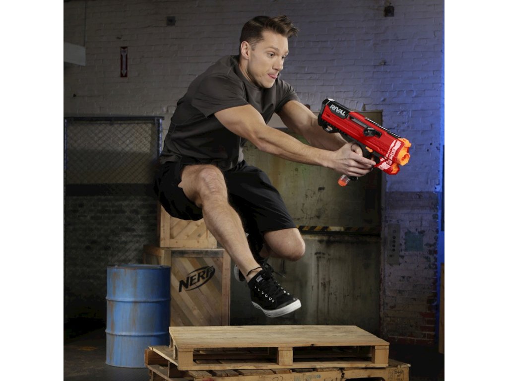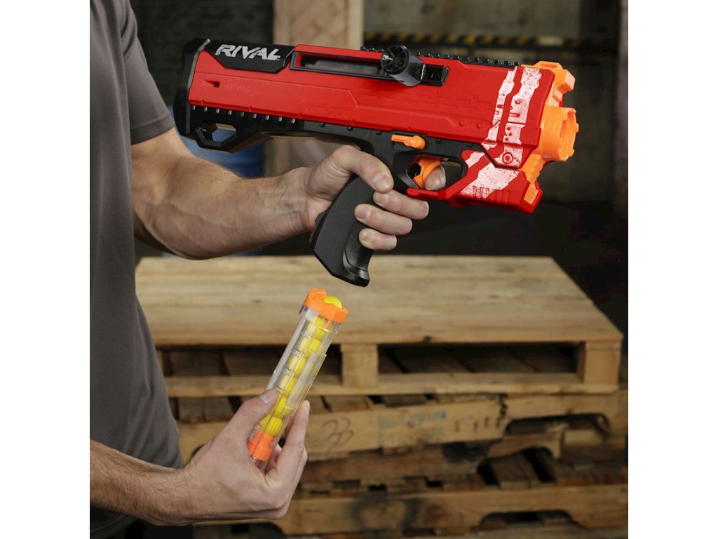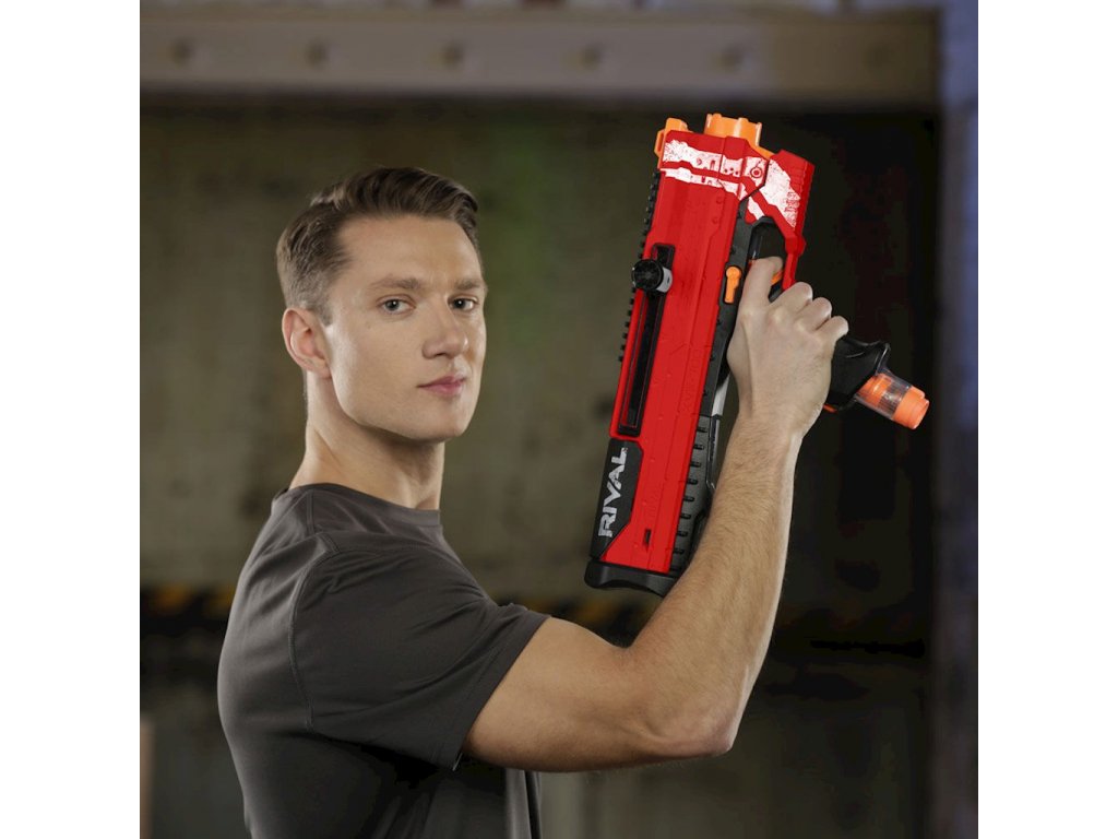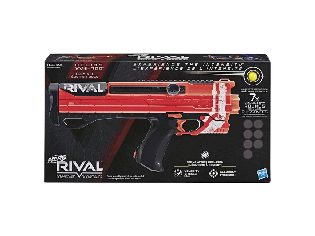 Helios XVIII-700 je odpalovací zařízení s rychlostí střelby 30 m/s! Výstřel je velmi přesný, takže vždy zasáhnete cíl. Nabijte zásobník náboji, natáhněte rukojeť až na konec a dopředu, stiskněte spoušť a vystřelte. Abyste zabránili náhodnému výstřelu, můžete použít pojistku spouště, která se nachází nad spouští. Zásobník pojme 7 nábojů.Čím Nerf Rival Helios XVIII-700 červený vyniká: