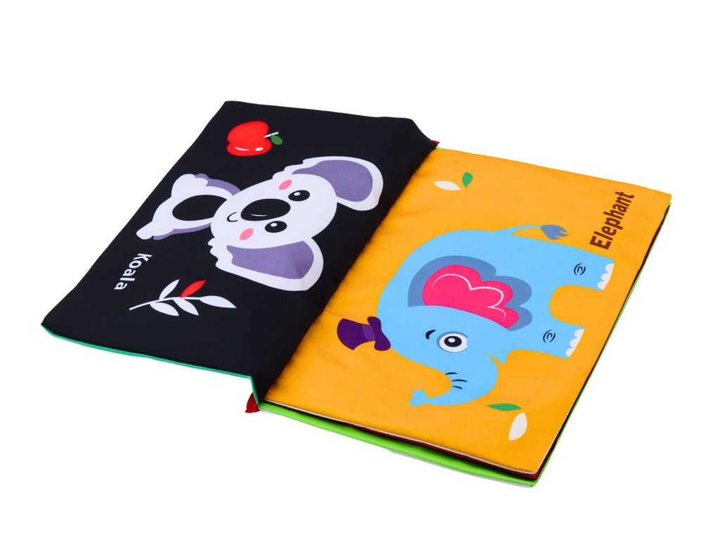 Součástí sady je také měkká šustící knížka s obrázky zvířátek, která poskytuje další smyslovou stimulaci.