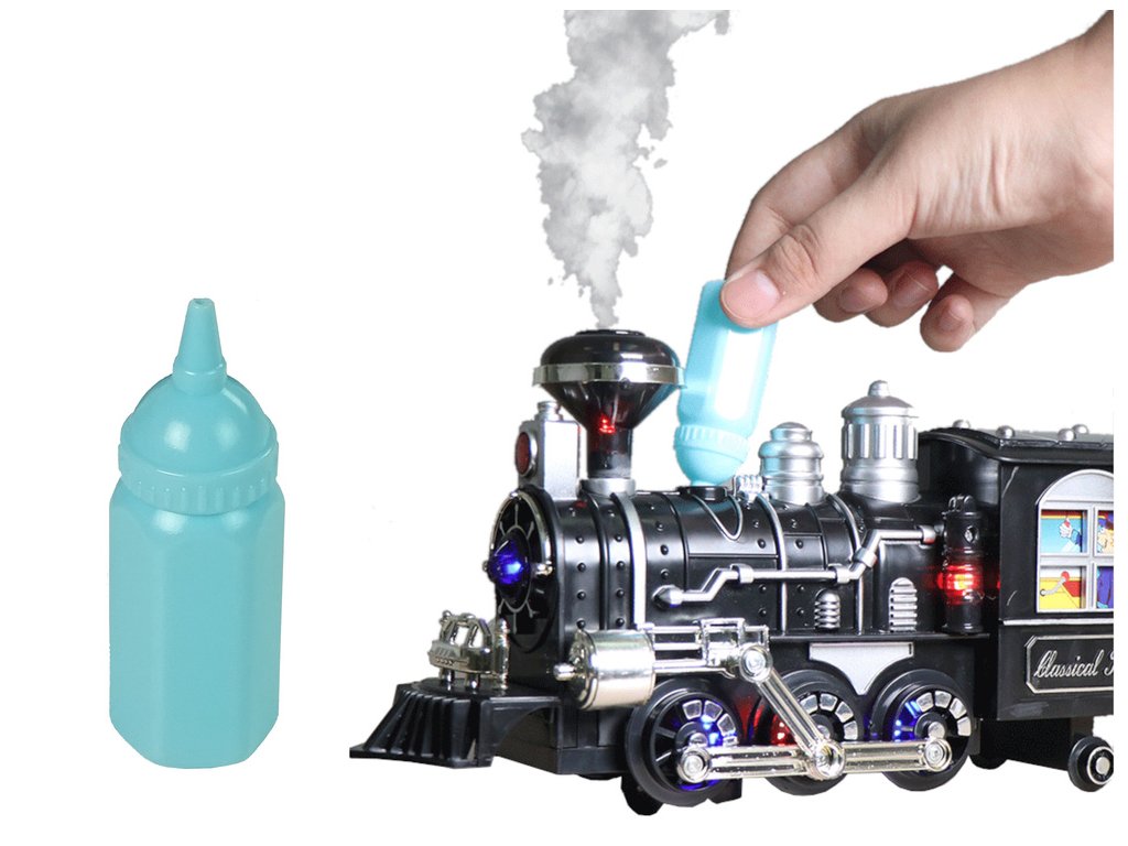Další výhodou produktu je přiložené kapátko - stačí nalít pár kapek do otvoru v lokomotivě. Při pohybu po trati je vidět pára tryskající z komína.