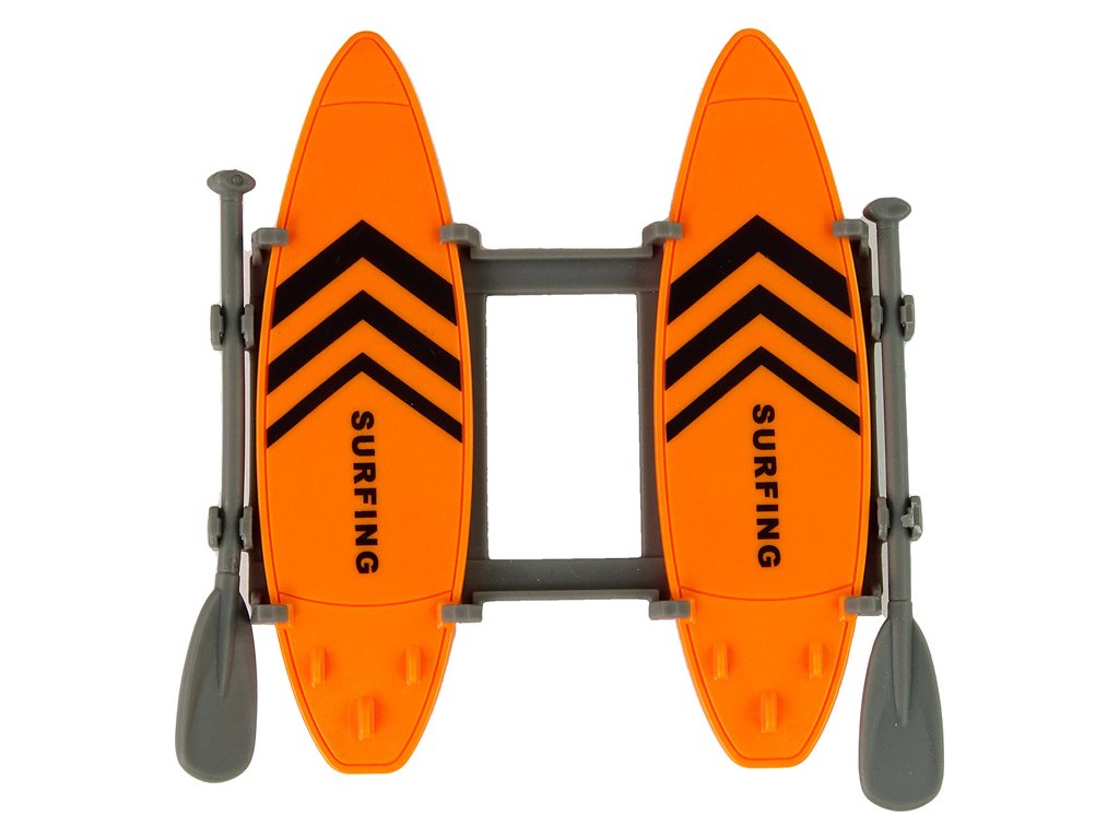 Na střeše auta jsou surfy a pádla, připravené k použití. Toto je ideální řešení pro lidi, kteří si chtějí vzít své surfařské vybavení na pláž a strávit aktivní den na vlnách.