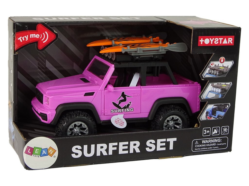 Toto růžové terénní auto s motivem surfování je perfektní volbou pro všechny, kteří milují plážová dobrodružství. Se svými světelnými a zvukovými efekty, otevíracími dveřmi a surfařským vybavením na střeše jistě zajistí nezapomenutelné chvíle během vaší dovolené na pláži.