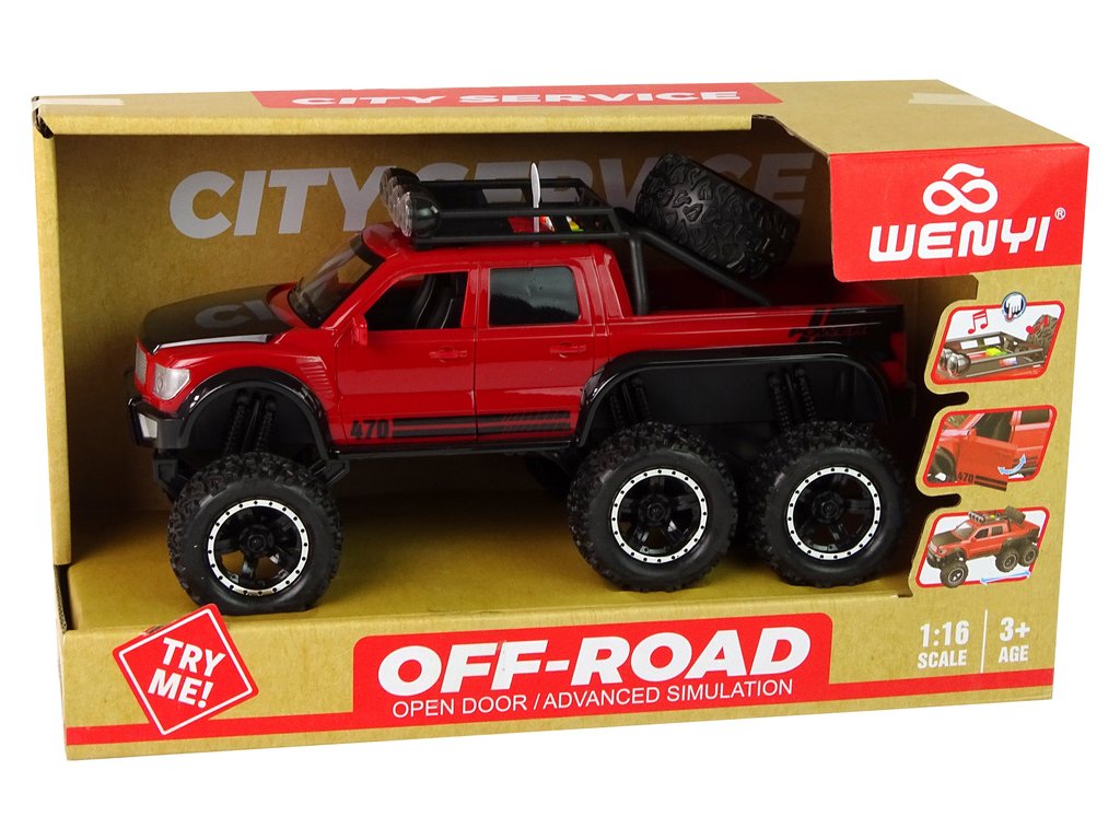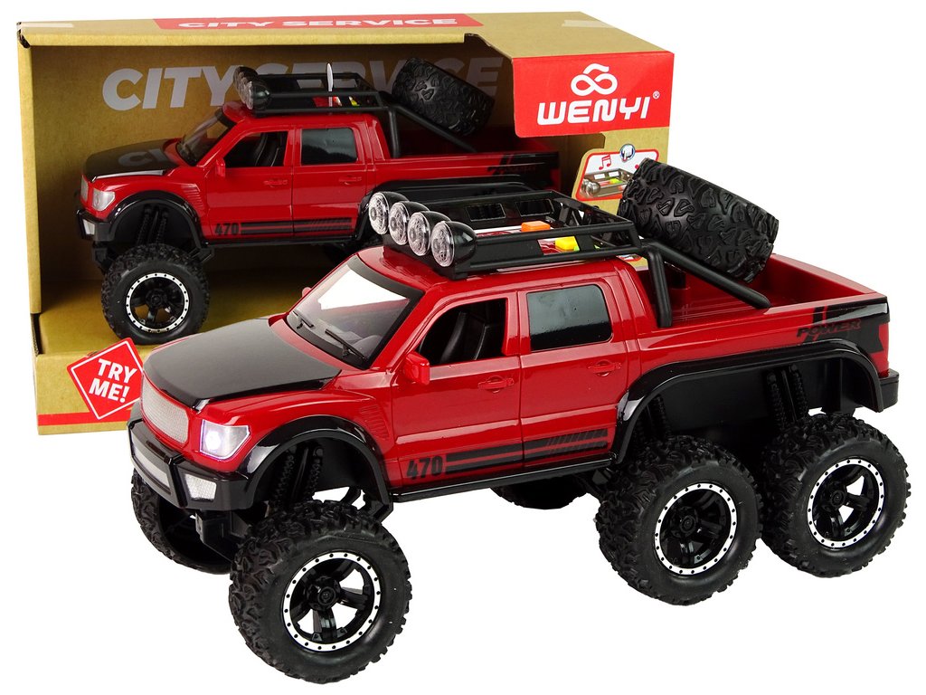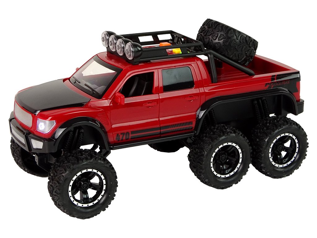 To vše doplňují promyšlené detaily, jako jsou tónovaná skla a přídavné kolo vzadu, které mu dodávají výrazný off-roadový vzhled. Doplňkovým prvkem obohacujícím zábavu jsou zvuky a světla. Kliknutím na barevná tlačítka v horní části vozidla si děti mohou vychutnat čtyři různé zvuky a sledovat, jak bliká se světly.