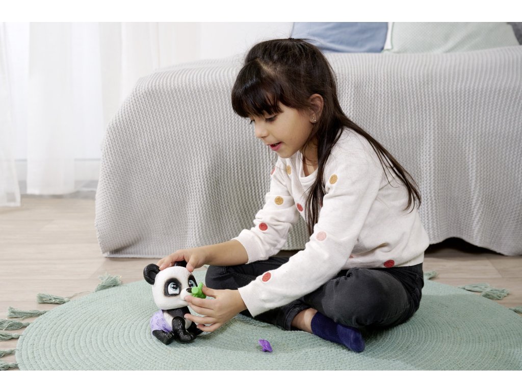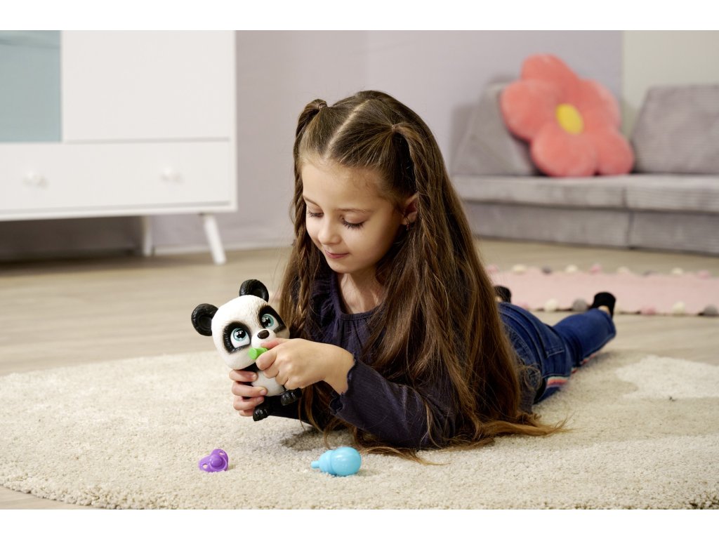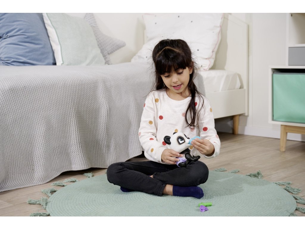 Pije a čůrá jako skutečný domácí mazlíček:.Panda pije vodu z přiložené láhve a poté čůrá do pleny, která se zbarví do žluta.