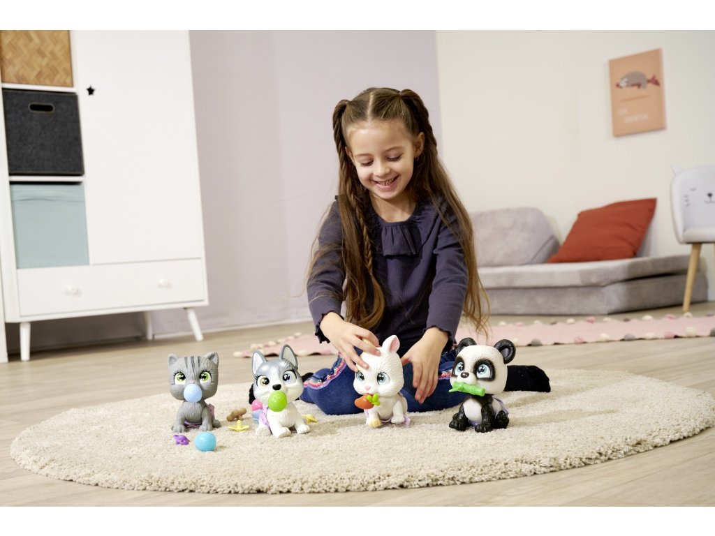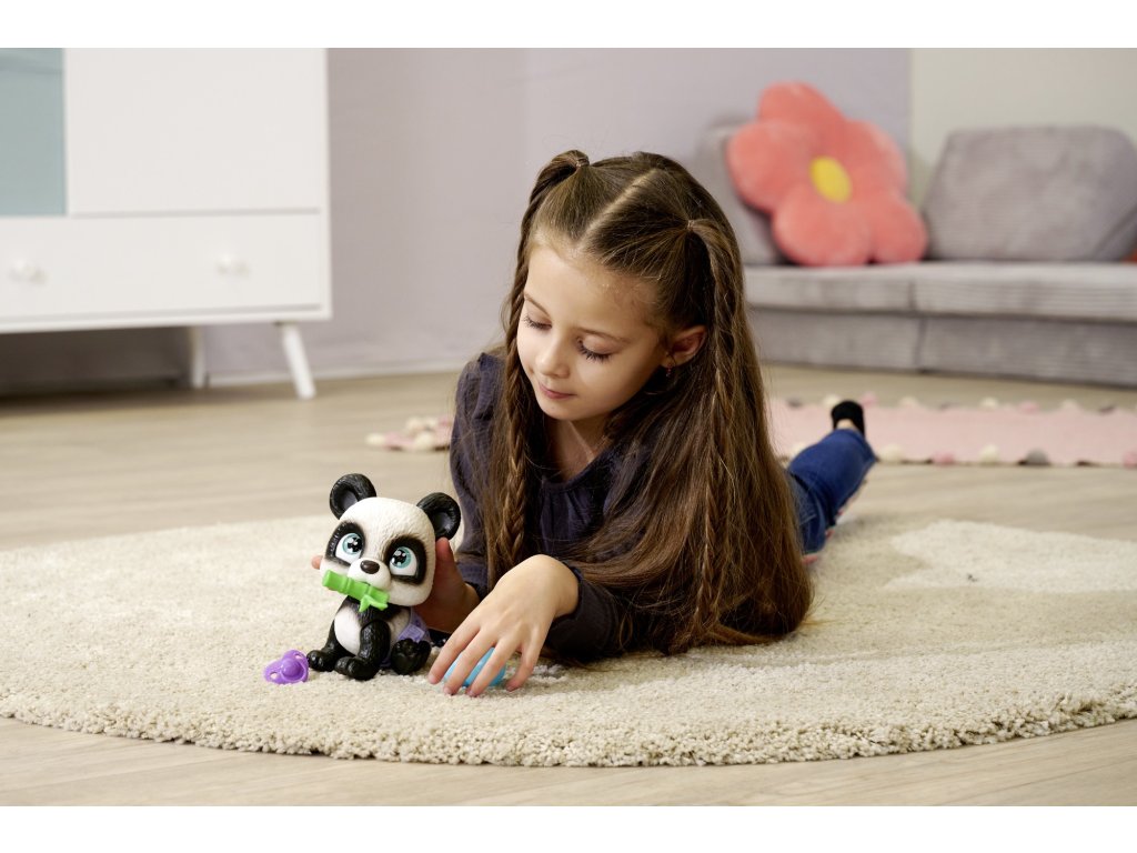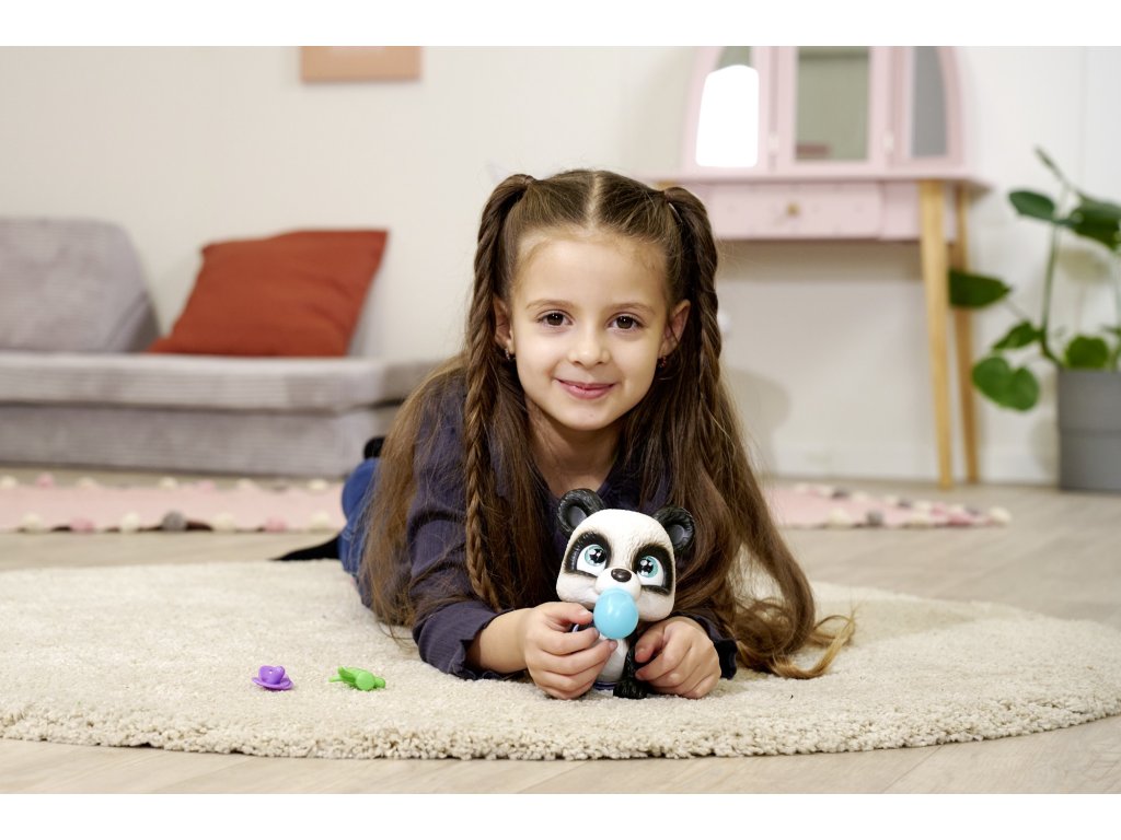 Kromě zvířátka, které je 24 cm velké24 cm, sada obsahujetři překvapení pro ošetřování a krmení, panda může příslušenství držet v tlamě. Baleno v estetické papírové krabici s uchem, kterou lze použít jako přenosný domeček pro zvířátko, a přiložené doplňky - překvapení balené v papírových sáčcích, ideální dárek pro kluka i holčičku.Sada navíc obsahuje adopční listinu pro zvířátko!