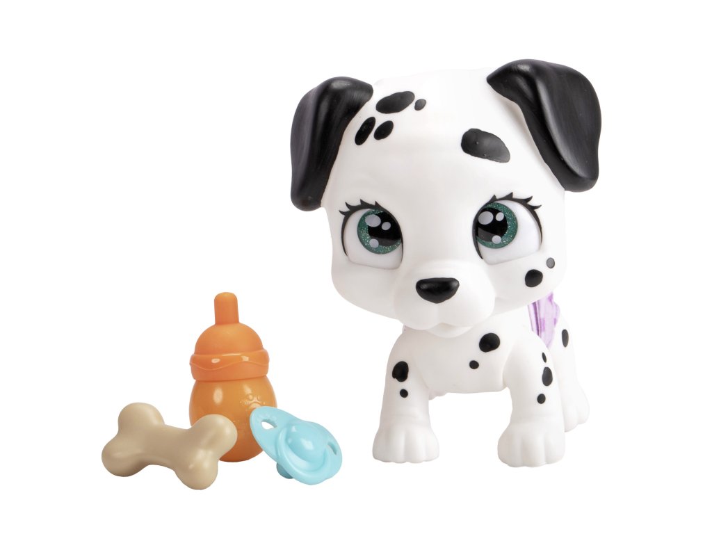 Bílé štěně s černými puntíky má velké zelené oči. Po otevření balíčku se dozvíme, zda jsme adoptovali holčičku nebo chlapečka.