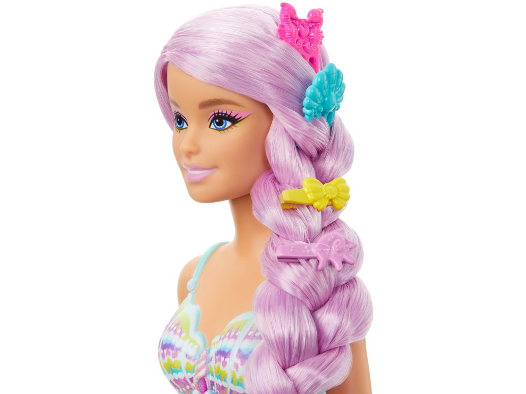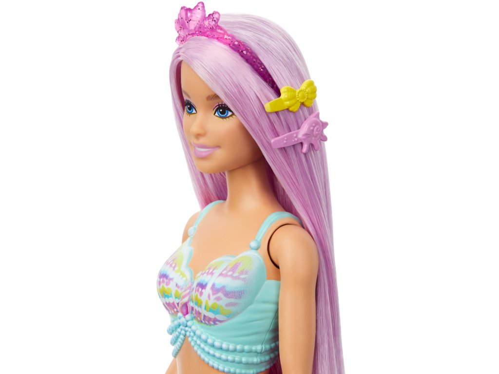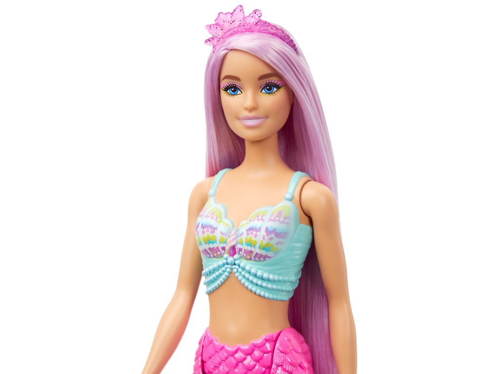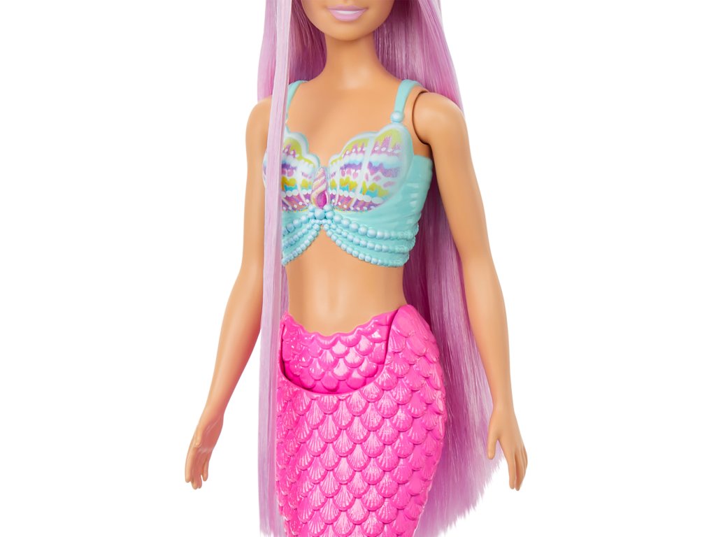 Barbie má světloupokožku, modré oči a dlouhé fialovérůžové vlasy. Mořská panna má růžový ocas s roztomilými detaily. Je oblečená do topu s detaily/span>toptur mušle a korál (vršek nelze sundat) a na hlavě má růžovou čelenku, která dotváří fantastický styl