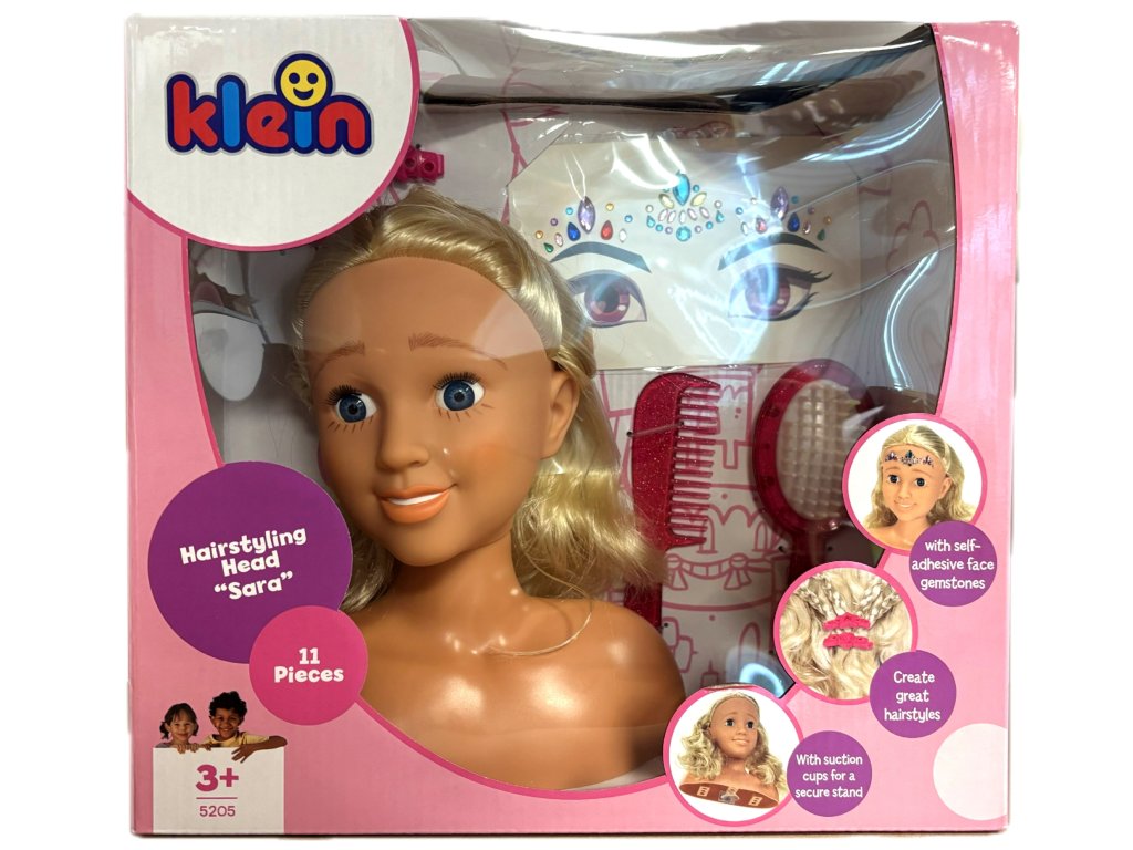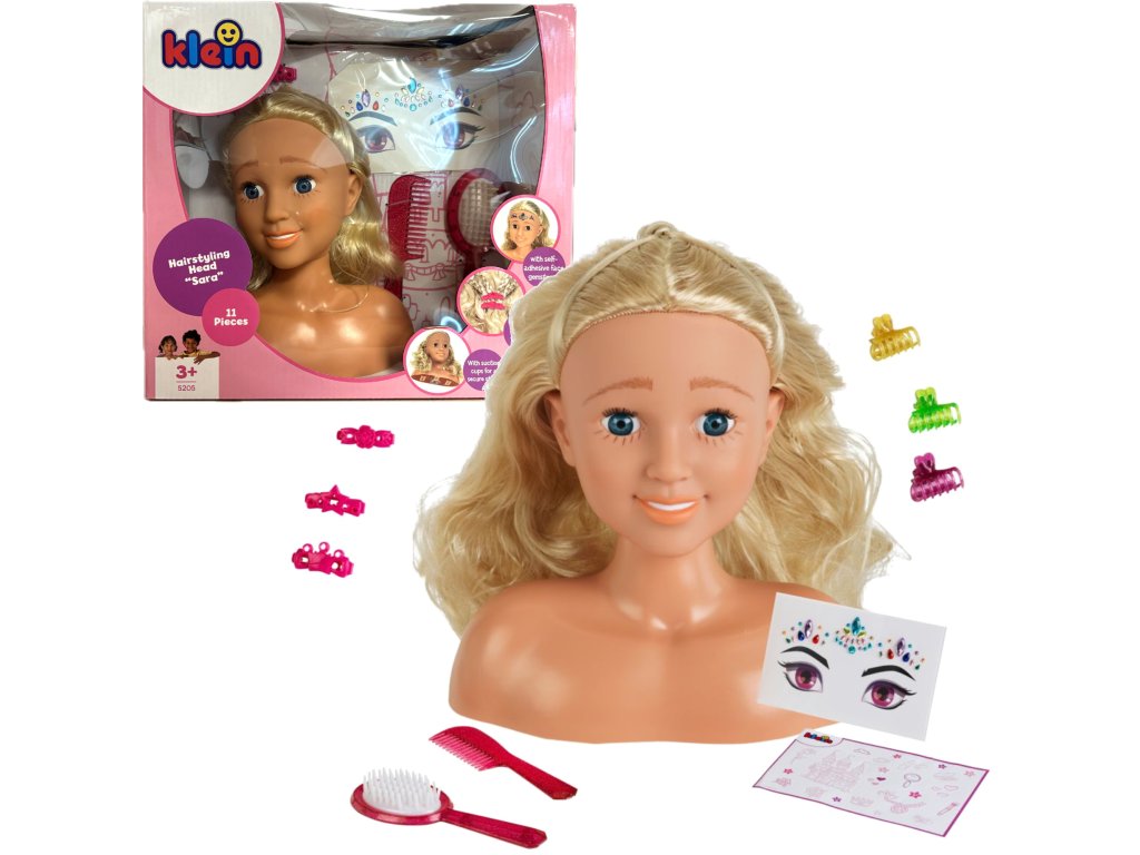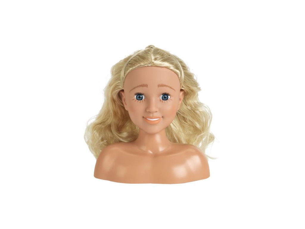 Tato stylingová hlava zobrazuje Saru - dívku s modrýma očima a dlouhými, lesklými blond vlasy .
